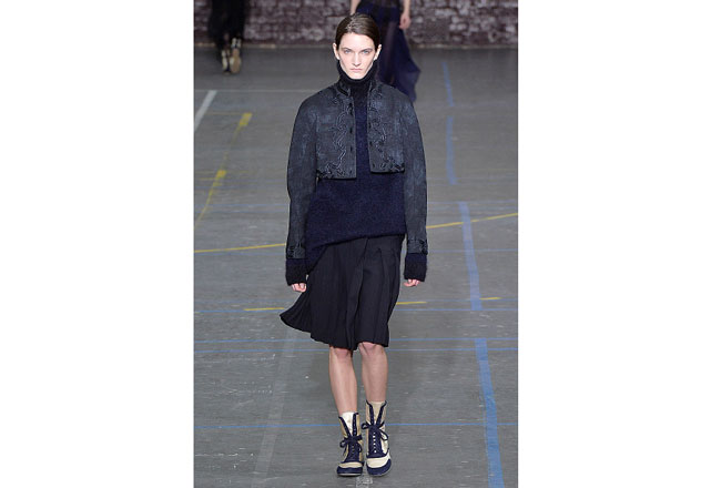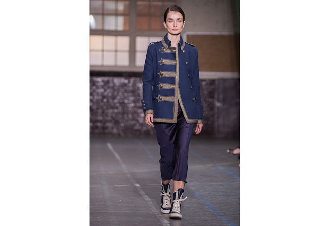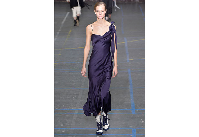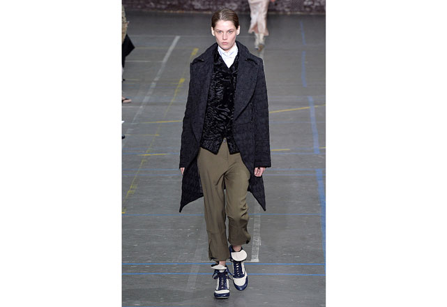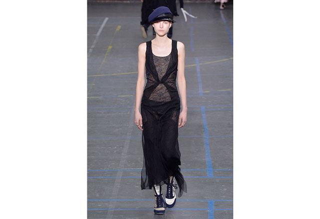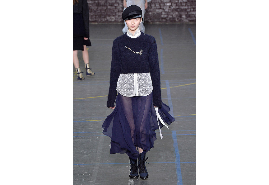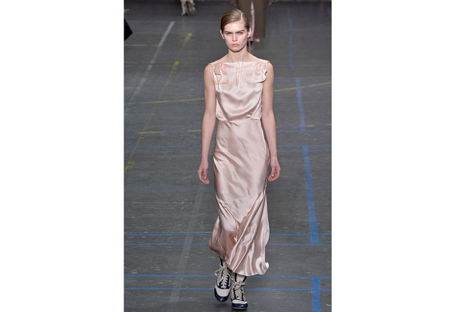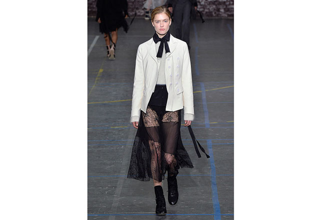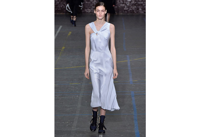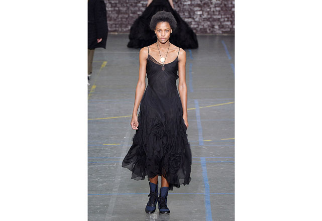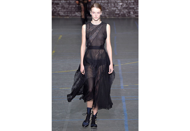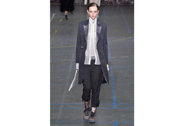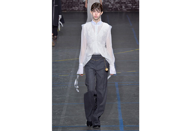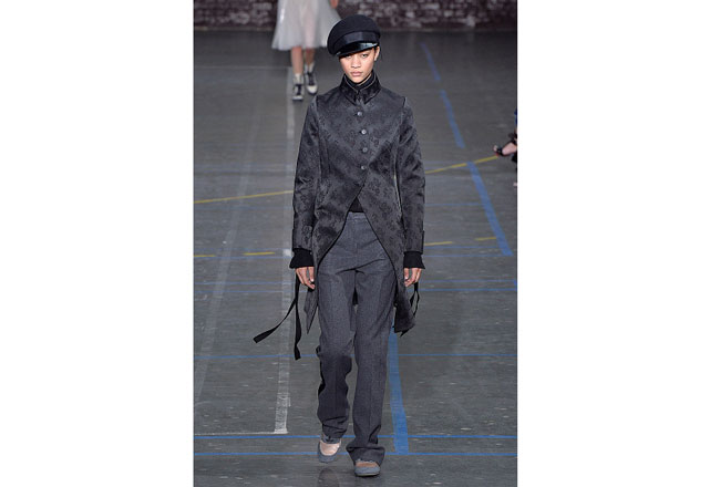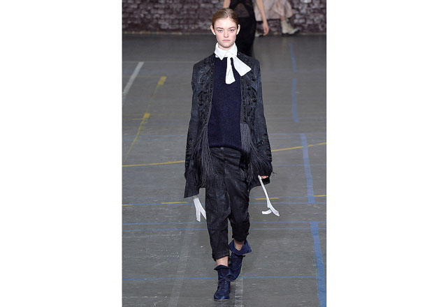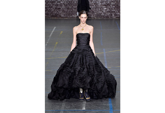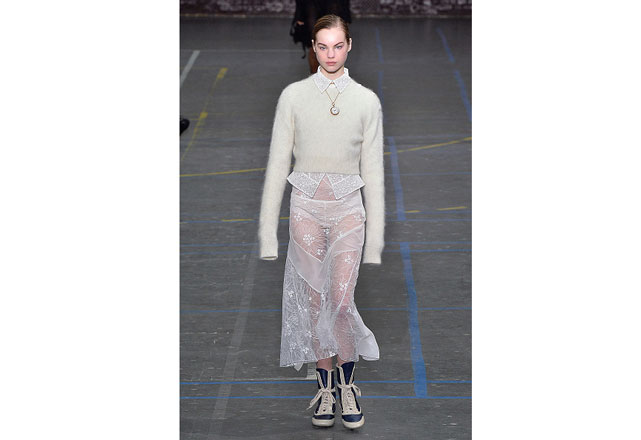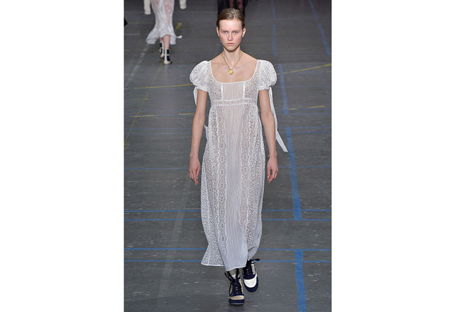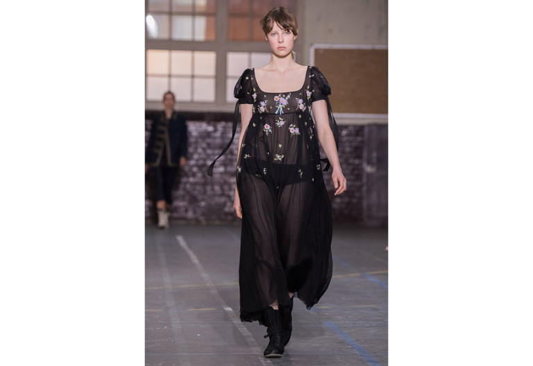Uma coleção clean e romântica foi a aposta da John Galliano para o inverno 2017. As peças confirmam, mais uma vez, as camadas sobrepostas misturando tecidos delicados, como renda e cetim, com casacos pesados de leve toque militar. Transparências, mangas sobrando e slip dresses chegam para contribuir com o combo de tendências em uma apresentação discreta, mas cheia de estilo.