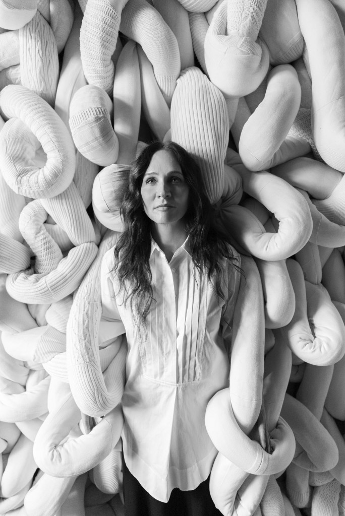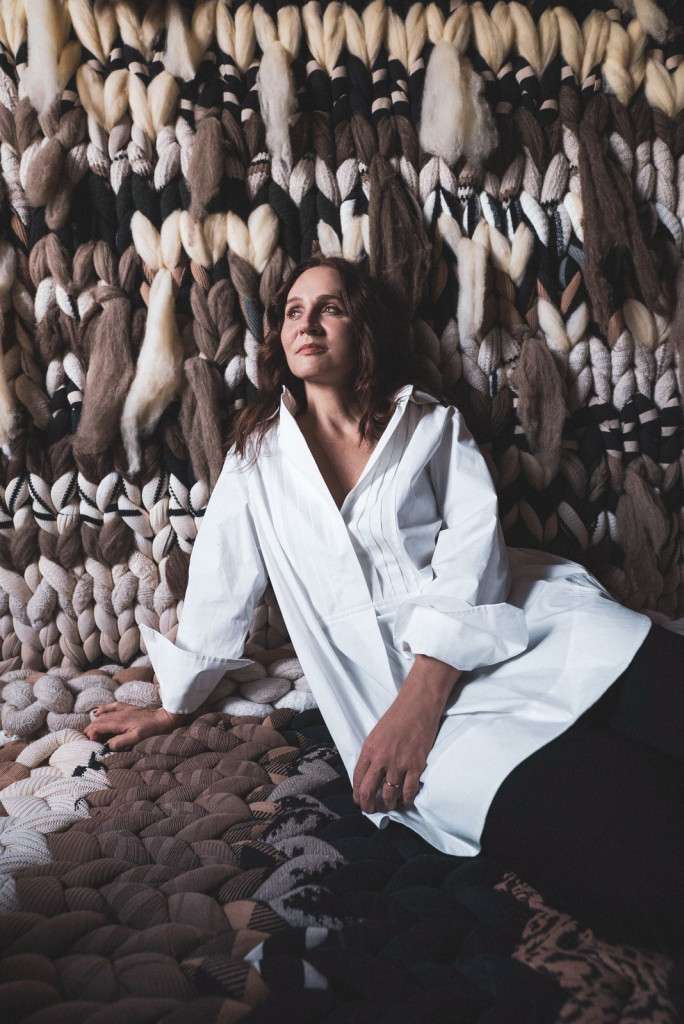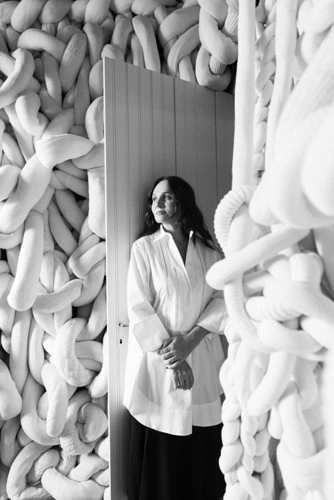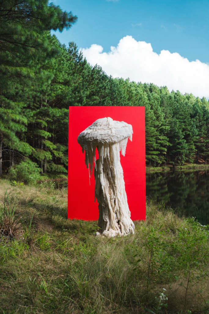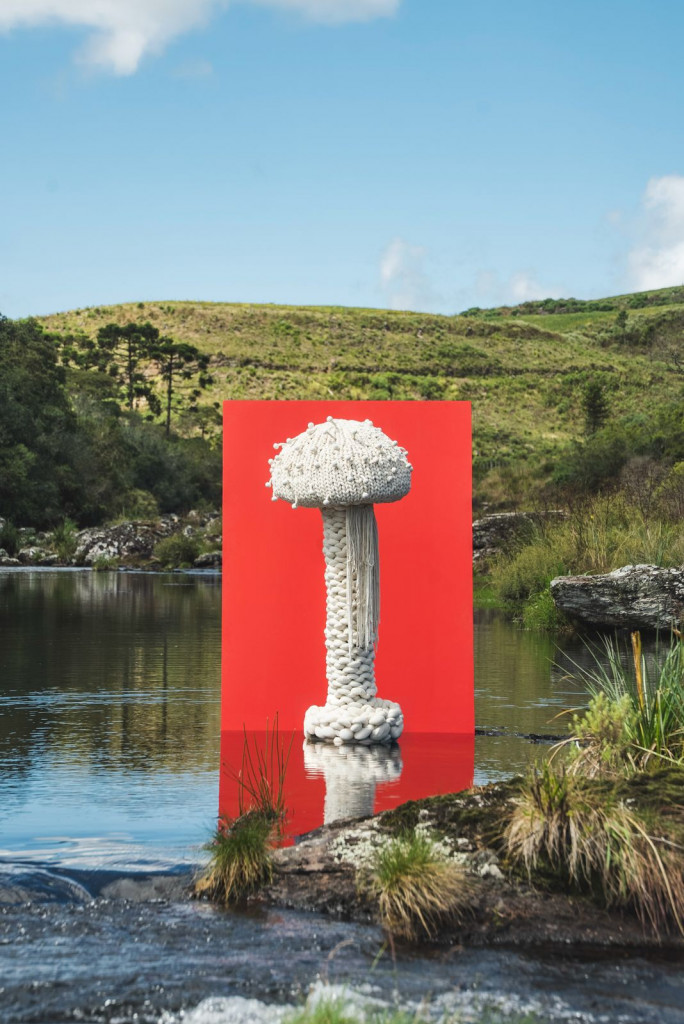 Nada no trabalho de Sandra Anselmi se impõe como forma acabada. Assim como os fungos se desenvolvem em silêncio sob o solo, sua obra “Natureza Tecida” germinou aos poucos — atravessada pela matéria, pela memória e pelo gesto manual. Iniciada mais de dois anos atrás, a série de esculturas têxteis que hoje se apresenta ao público nasceu do encontro entre técnica e intuição, saber e improviso. Como ela mesma descreve, “construo a minha obra de maneira em que as tramas do tricô propõem uma complexidade distinta: cada fio representa um indivíduo; cada nó, um ponto de encontro de histórias e saberes”.