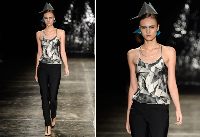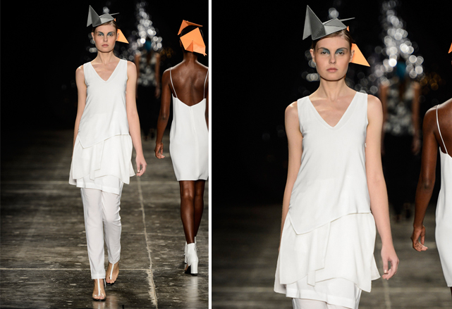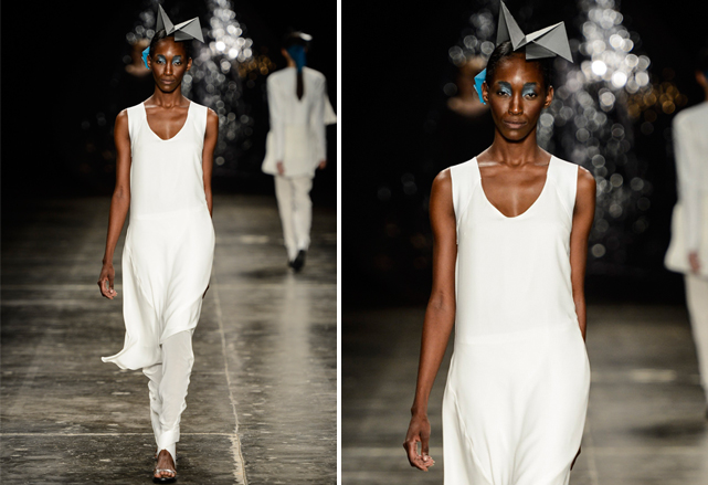 Pensou em uma estética minimal? Pense mais. Raquel leva o conceito ao extremo, com resultados elegantes mesmo com um simples slip dress branco, sem acessório nenhum, apenas com a sandália gráfica em verniz e plástico transparente. Na cabeça, a dobradura extraída da obra “Bichos”, que também compõe a única estampa da coleção.