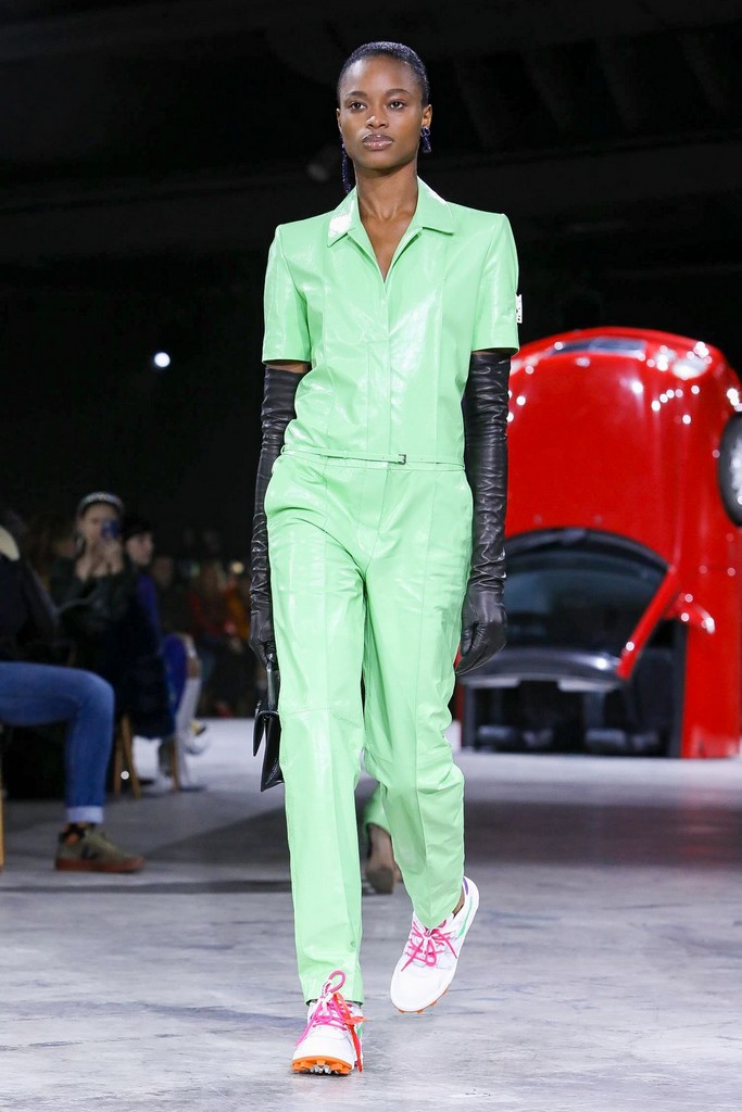 No inverno 2020 da Off-White, Virgil Abloh se mantém fiel à estética esportiva desconstruída, desta vez mixada aos elementos couture de festa e alfaiataria. O cenário com carros cortados em pedaços dão o tom de que o automobilismo permearia os looks. Então, pied-de-poules surgem desfigurados, como se estivessem em movimento, assim como os elétricos tons de neons acendem a passarela.