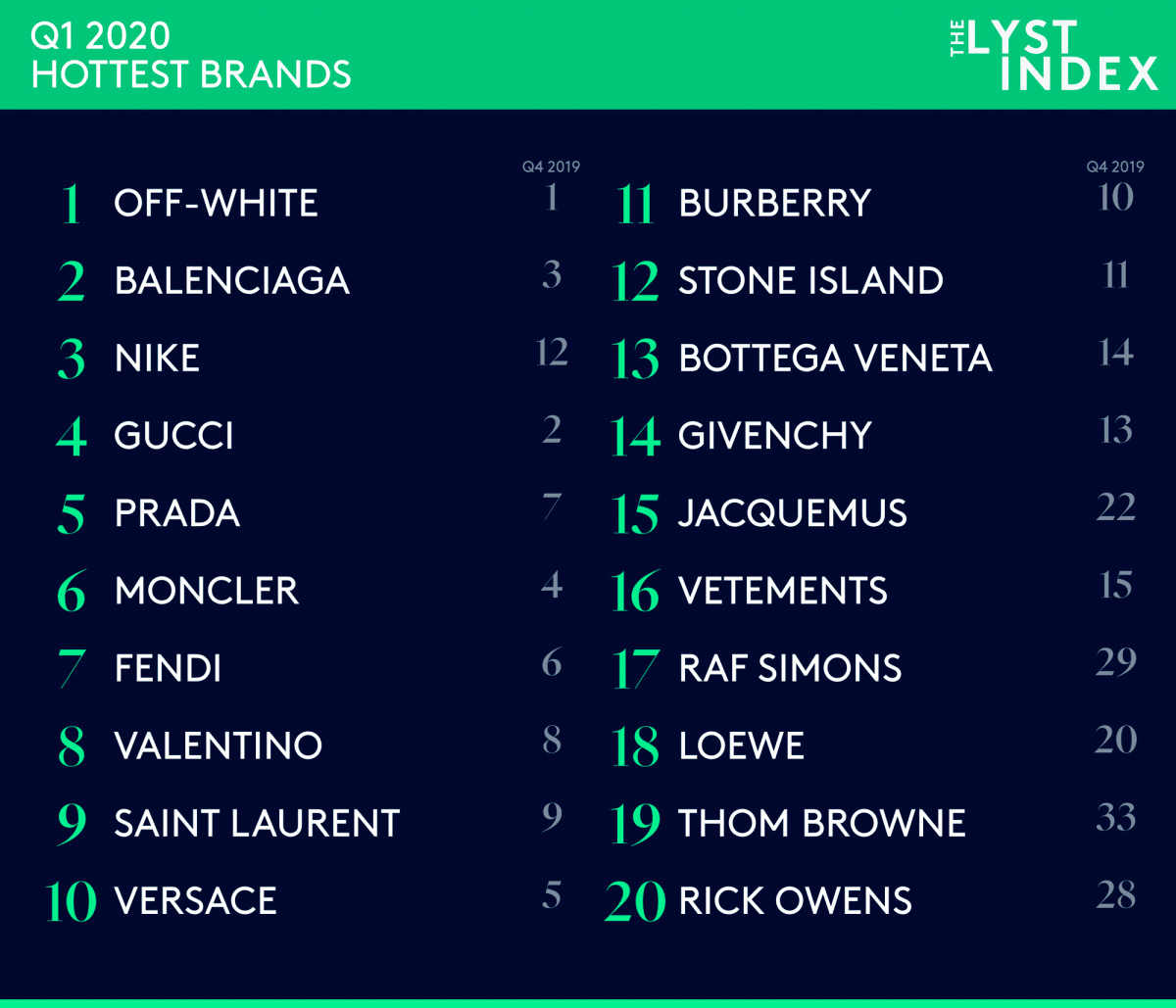 Nesta quarta-feira (29.04), a plataforma de pesquisa global Lyst divulga seu ranking trimestral das marcas de moda mais cobiçados para o início de 2020 – e, mais uma vez, o Off-White de Virgil Abloh ficou em primeiro lugar.