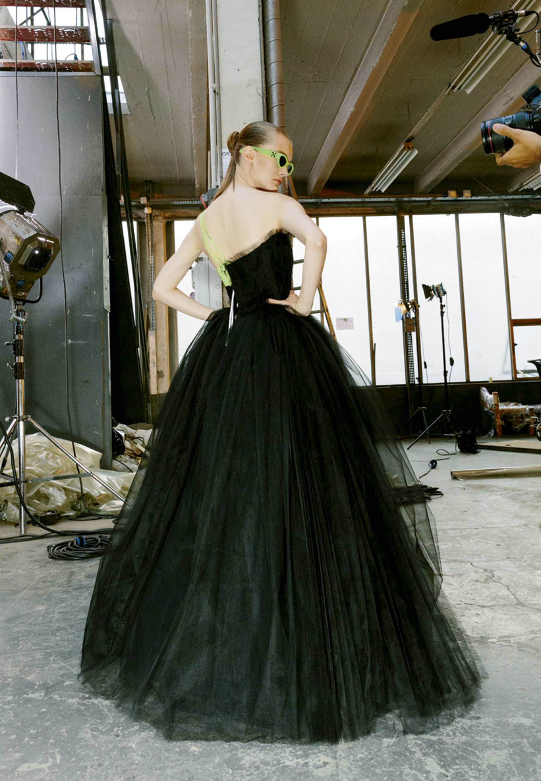 Como os vestidos azul assimétrico e preto de tule com corpete tipo espartilho – mezzo tomara-que-caia, mezzo top esportivo. “As texturas e silhuetas abraçaram o conceito de unir moda e esportes, e tornaram a coleção mais couture”, evidencia. Ele conta que simplesmente adorou trabalhar nessas peças. “Personifiquei a feminilidade se chocando contra o vestuário atlético. Foi legal ver o resultado dessa união.”