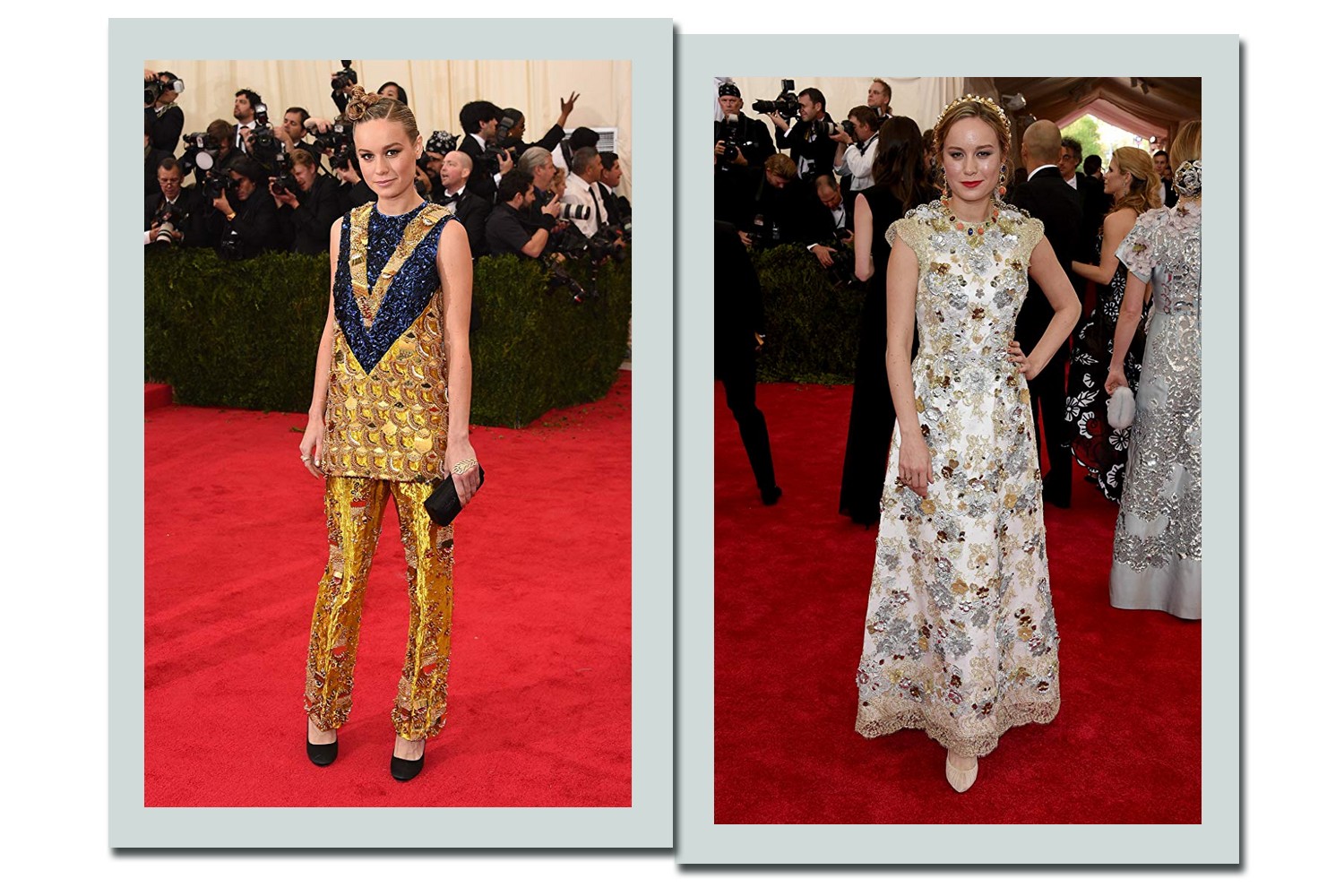 Assim como diversas celebridades, Brie Larson aproveita o Met Gala para ousar e escolher peças mais detalhadas. Em 2014, a atriz brilhou com uma calça e blusa da Prada, ambos dourados. No ano seguinte, a label escolhida da atriz foi a Dolce & Gabbana, com um vestido tod enfeitado com pequenas flores.