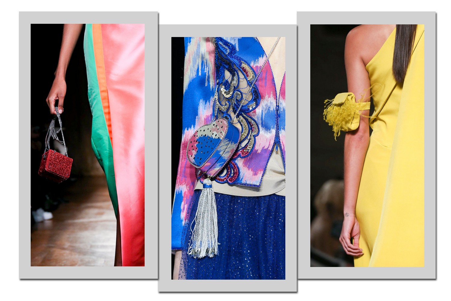 Quando o assunto são as bolsas, as grifes inovaram nos formatos escolhidos. Uma peça quadrada foi a aposta de RVDK, enquanto a Armani Privé apresentou uma versão colorida em formato de coração. Já Antonio Grimaldi mudou a pochete de lugar e criou uma versão com plumas para ser usada no braço.