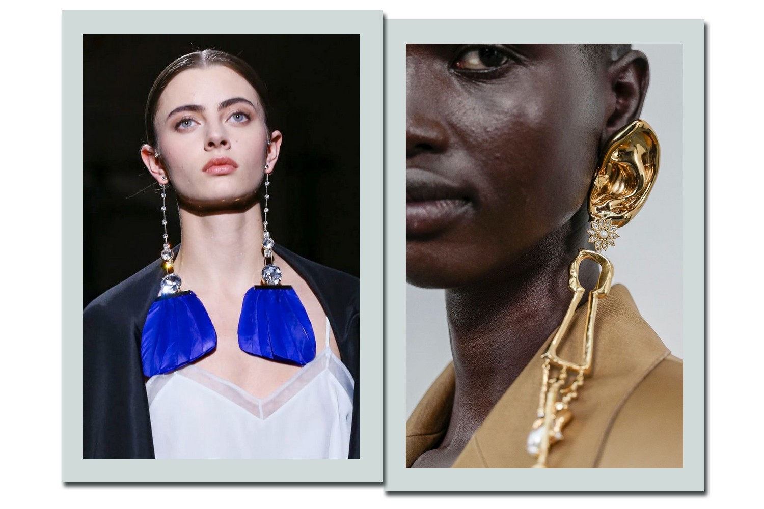 A tendência da temporada são brincos enormes, que caem pelo colo ou preenchem todo o lóbulo. Valentino apresentou enormes acessórios que misturam plumas e cristais, enquanto Schiaparelli preferiu versões cromadas. Mas preste atenção: nem sempre o mesmo brinco precisa ser usado nas duas orelhas.