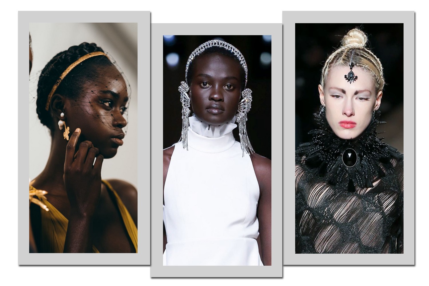 Diversas marcas investiram em acessórios de cabeça, incluindo chapéus, fascinators, tiaras e voilettes. Perfeitos para incrementar qualquer look, esse tipo de peça também pode substituir um penteado mais elaborado e funciona perfeitamente para festas. Entre os destaques, Dior apostou em voilettes de diversas cores neutras, apoiados por tiaras, enquanto Givenchy apresentou tiaras com cristais – que se misturam com enormes brincos. Bazaar amou o handband preto apresentado por Julien Fournie.