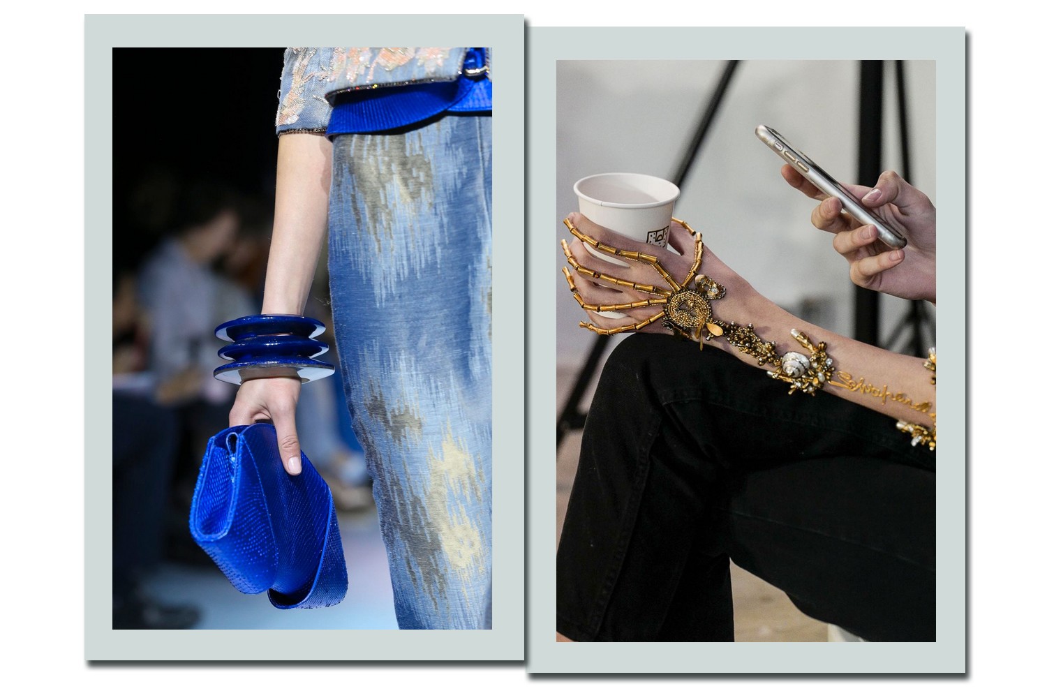 Assim como os brincos, as pulseiras ganharam grandes modelos e diferentes materiais. Enquanto a Armani apostou em versões coloridas de acrílico, Schiaparelli apresentou uma peça que percorria todo o braço e ficou popular na internet.