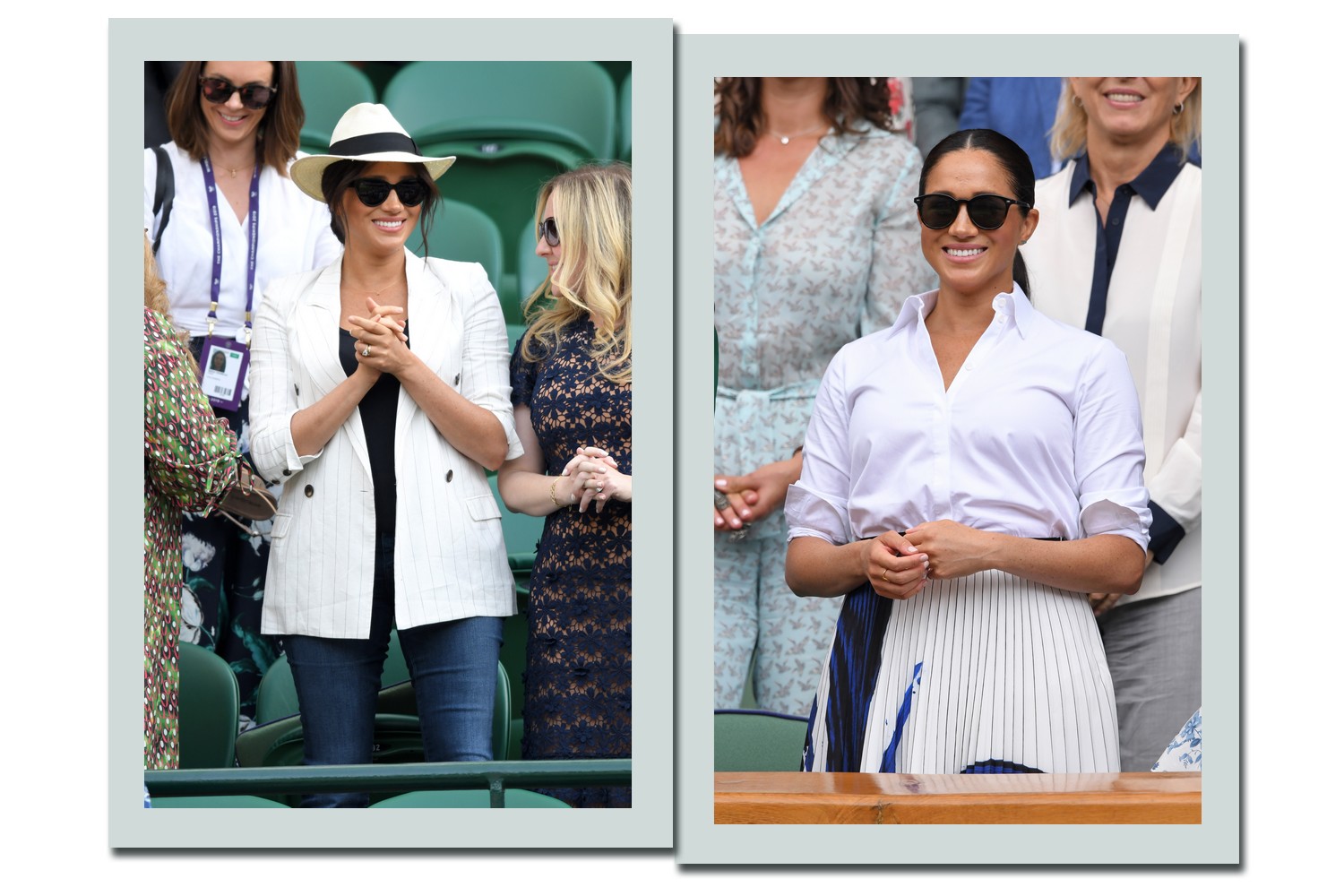 Para assistir aos jogos de Wimbledon, Meghan Markle escolheu duas opções que unem conforto e elegância. Na primeira aparição no campeonato, a duquesa usou calça jeans combinada com uma camiseta preta e blazer branco listrado – tudo de grifes australianas: L’Agence, Brea e Outland Denim. Para protegê-la do sol, óculos escuros e um chapéu Panamá. Já no final da disputa, Meghan optou por uma saia plissada com uma camisa branca, da Boss.