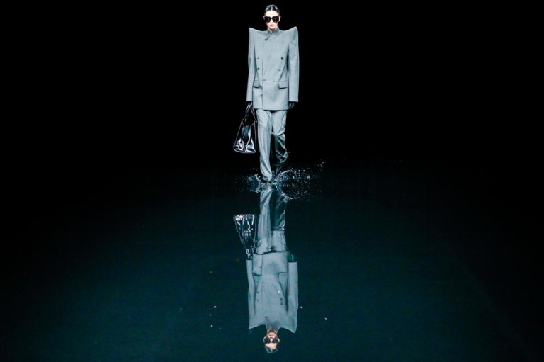 Manhã do primeiro dia de março em Paris, e o ginásio montado em um estúdio de cinema está inundado, com suas primeiras fileiras submersas. É o desfile do Fall 2020 da Balenciaga, no qual o estilista Demna Gvasalia pensa em um cenário apocalíptico de céu relampejante e muito preto, muito longo, muita alfaiataria com ombros pontudos.