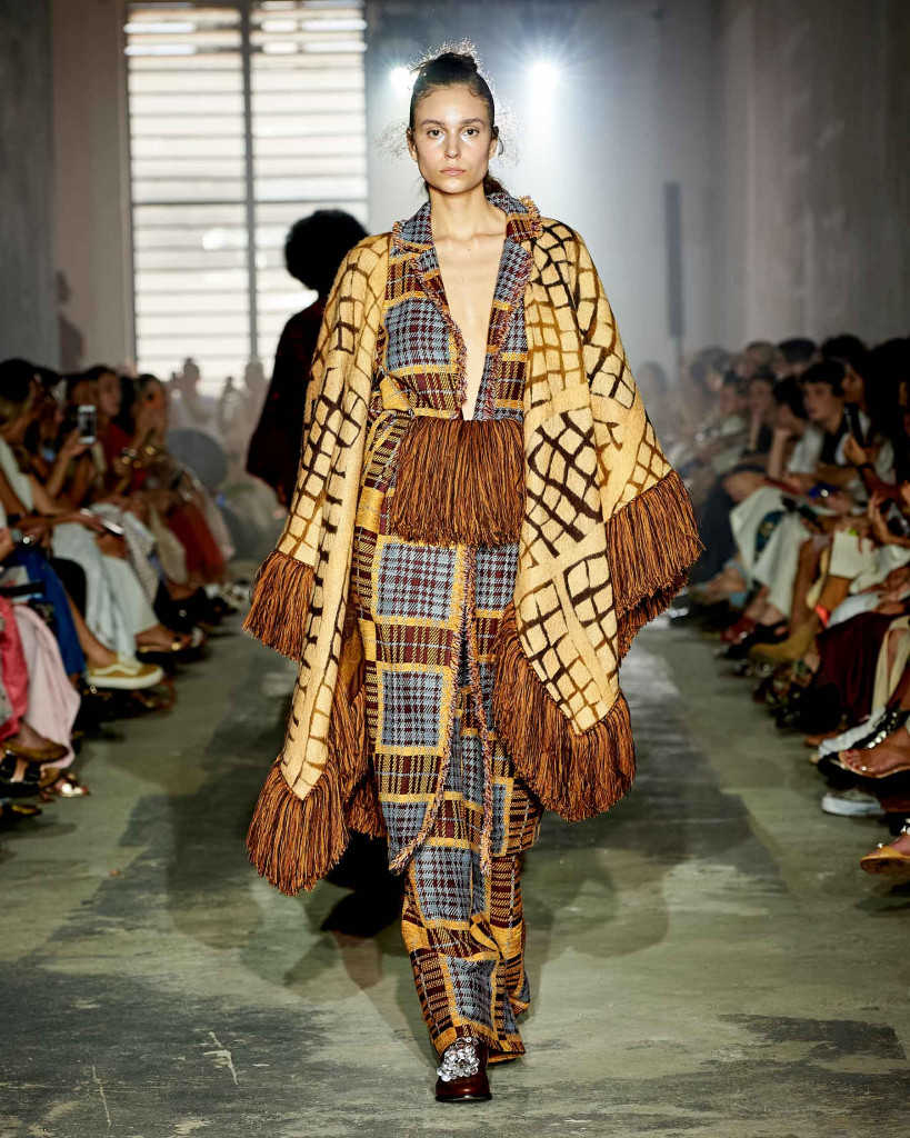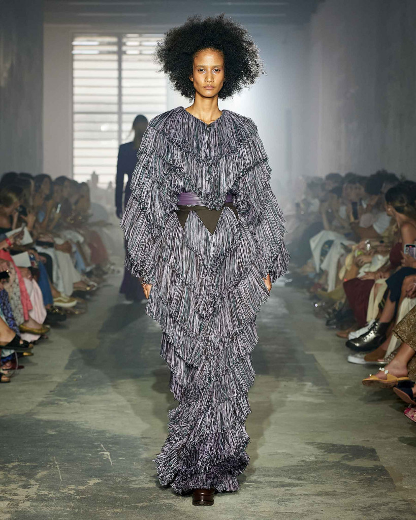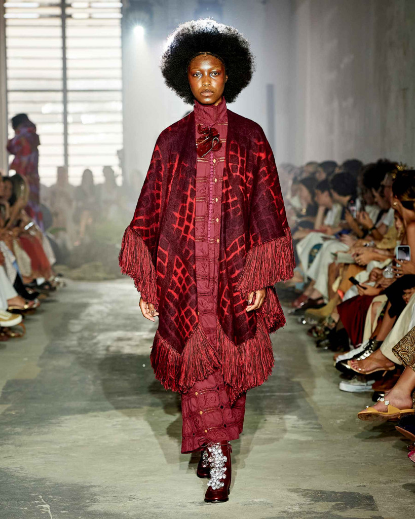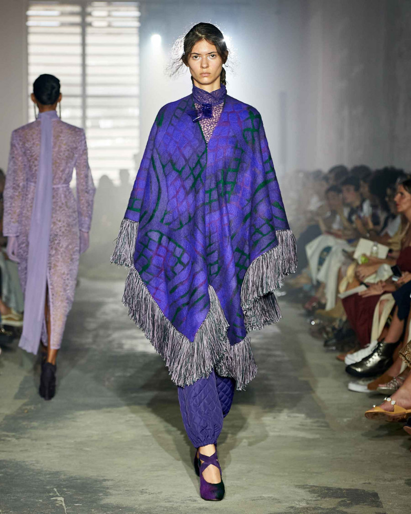 O simples fica presente apenas na maçã envolvida por tricô presenteada aos convidados. Na passarela, as franjas, as mangas bufantes, a assimetria das camadas e a combinação entre vermelho e roxo criam um maximalismo fantasioso que encanta. Um presente a quem ama criações elegantes em que o mais é mais!