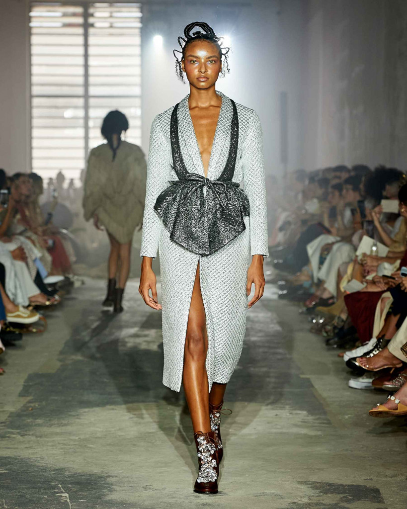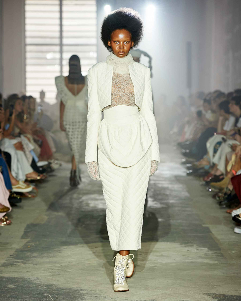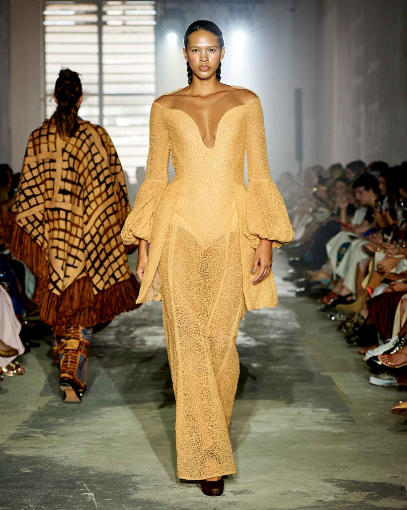 O som dos bordados das roupas e das contas transparentes que enfeitam luvas e sapatos, as penas aplicadas em pesados casacos, o brilho dos brocados e os tecidos recortados resumem com perfeição a festa de sensações criadas por Paula Raia em sua coleção de inverno 2023.