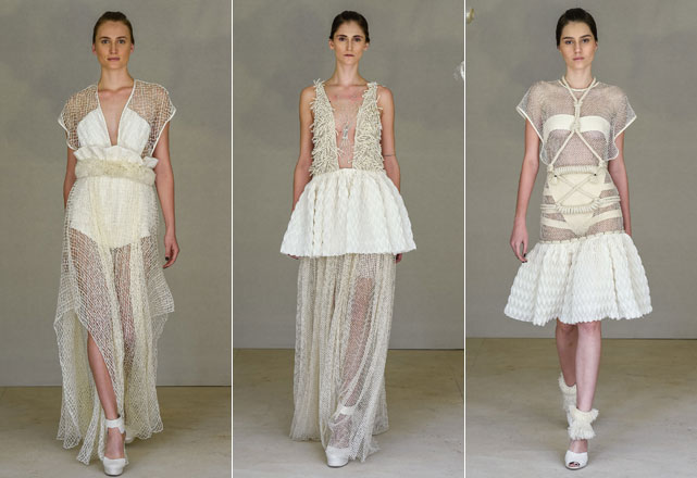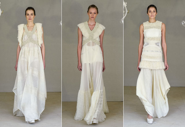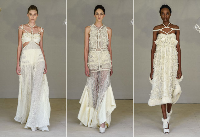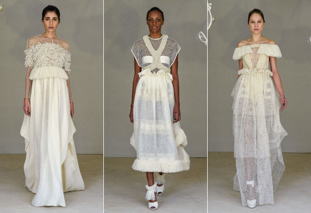 “Eu quis trabalhar com os materiais na essência, sem tingimento, falo de algo natural, nítido, que simboliza leveza”, explica Paula Raia sobre seu verão 2016, construído em camadas e sobreposições num excelente trabalho têxtil que transforma o rústico (redes de pescadores, cordas em seu estado natural, linhas e algodão) em texturas trançadas e tramadas.