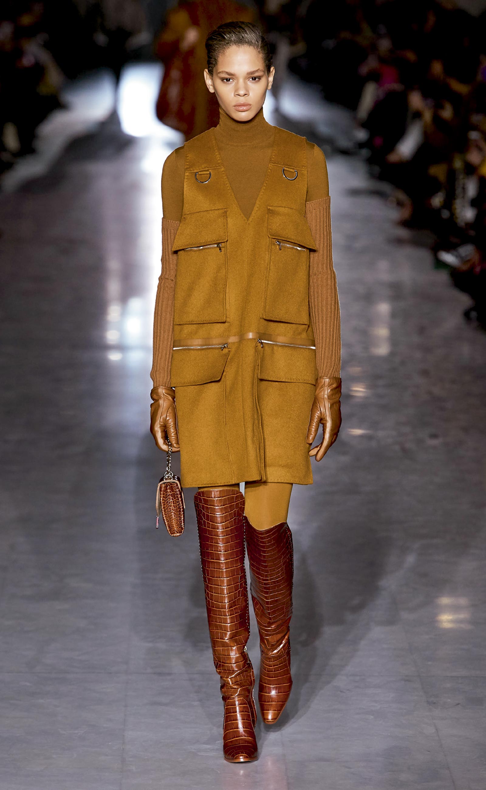 Bolsos decisivos e metais conferem à peça uma cara utilitária, enquanto a ausência de mangas e o decote em “V” favorecem sobreposições, bem ao gosto setentista.