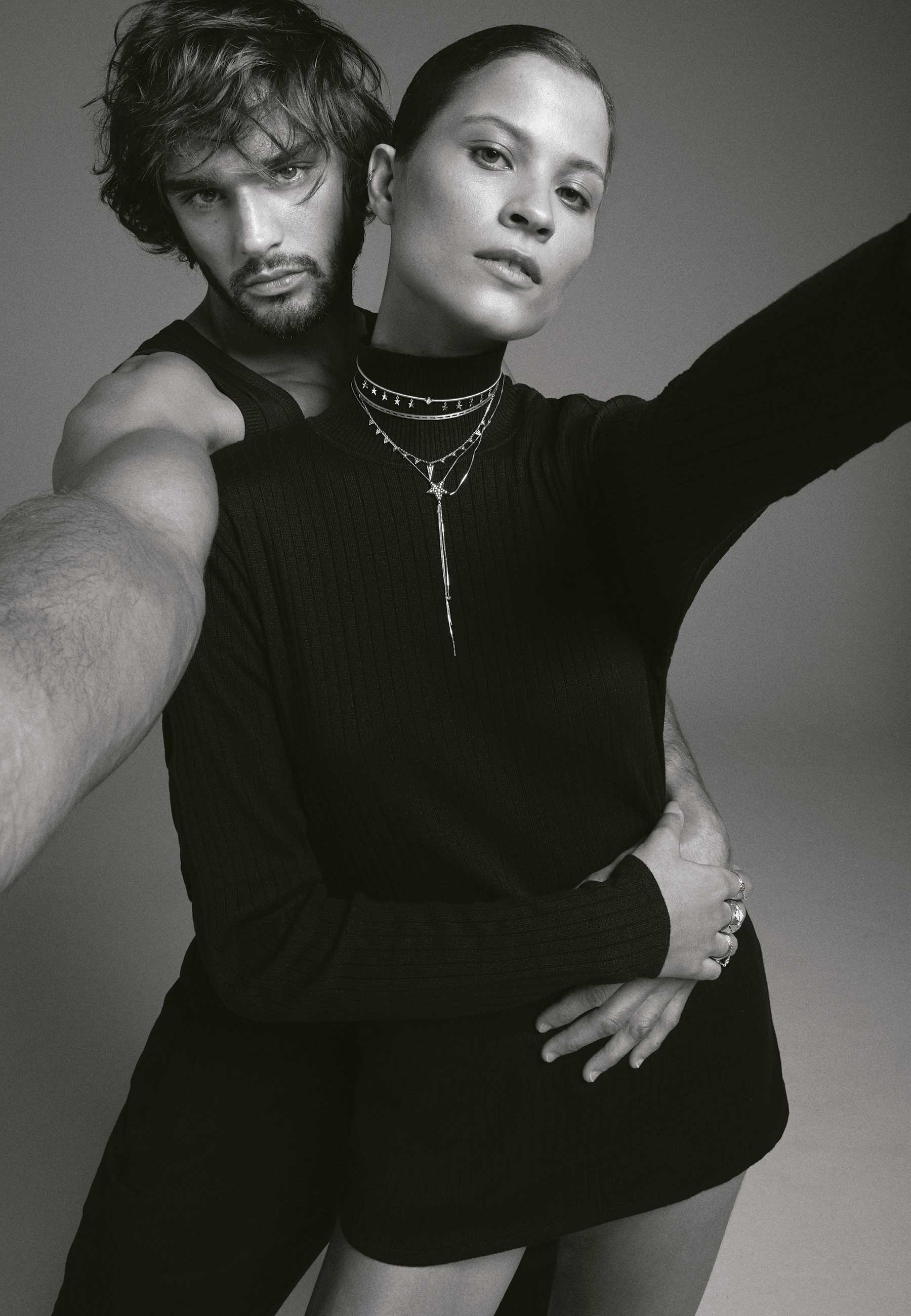 Marlon usa camiseta e calça de couro Torinno e Ari usa, no dedo anelar, anel Crossroads; no dedo do meio, aliança Love, ambos em ouro 18k com diamantes; e, no dedo indicador, anel Code com quartzo whisky e diamantes, tudo Animale Oro. Na foto recortada, Marlon veste tricô Torinno e Ari veste cardigã de tricô Animale; choker Gap em ouro 18K e corrente em ouro 18k Animale Oro.