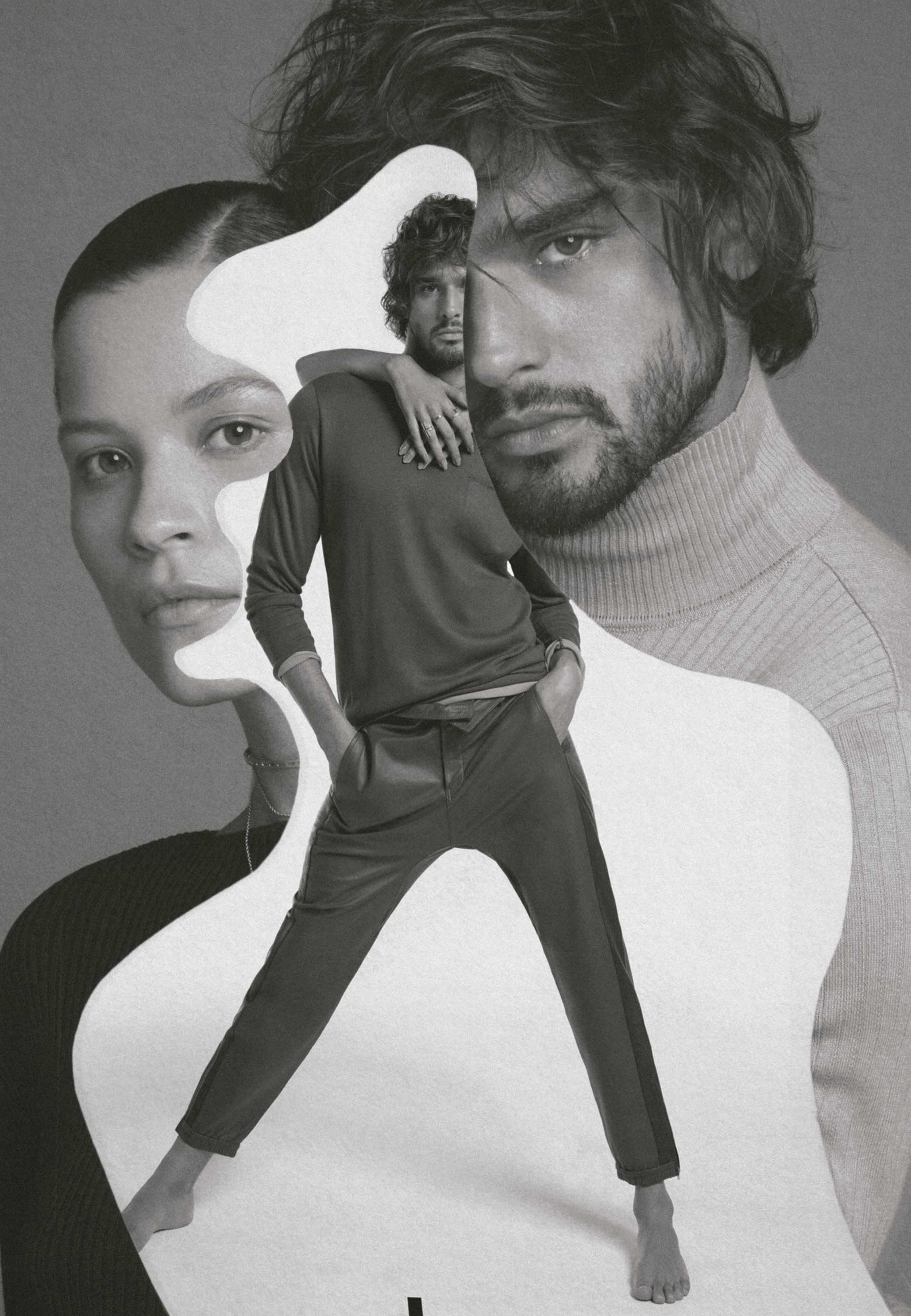 Marlon Teixeira (Way) usa regata e calça Torinno. Ari Westphal (Mega) veste cardigã de tricô Animale e (de cima para baixo) anel Gap Duplo Ouro, anel Grid Round, aliança Gap, todos em ouro branco 18k e diamantes Animale Oro.