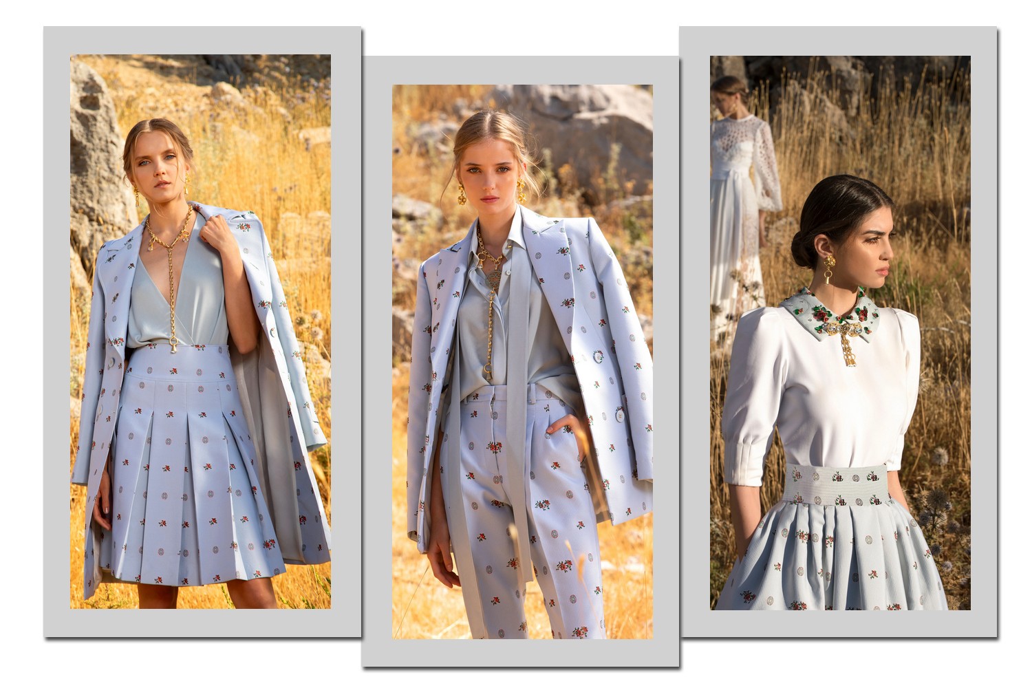 Uma série de looks azuis com uma série de pequenos bordados de flores encanta pela delicadeza e doçura.