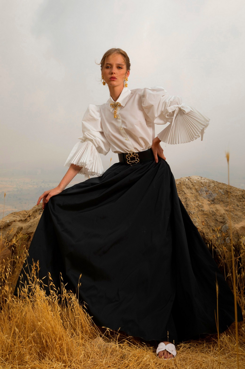 A camisa com mangas plissadas e volumosas combinada com a saia marinho, acessórios dourados e rasteirinha branca resultou no look mais lindo da apresentação.