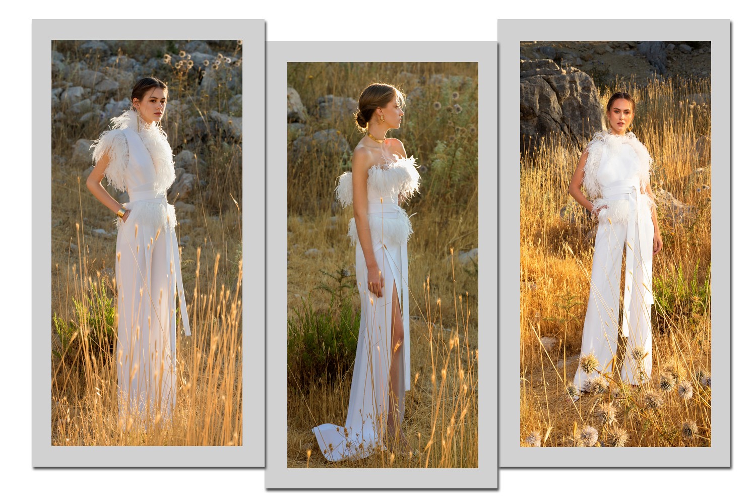 Vestidos e macacões brancos ganharam detalhes em plumas que acrescenta, ao mesmo tempo, volume e leveza.