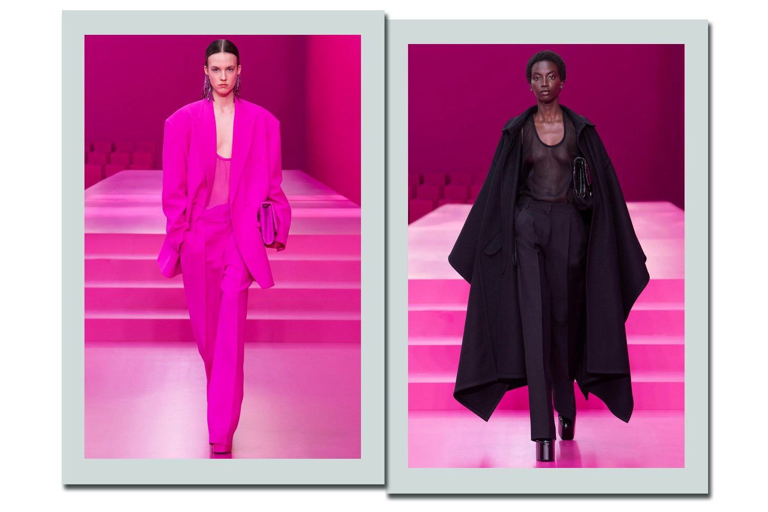 Tanto o rosa, quanto o preto valorizam a alfaiataria impecável da marca.