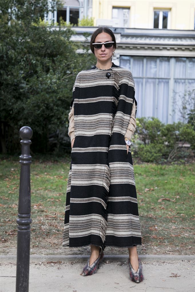 Com 0 poncho longo, listrado e com fecho com abotoamento na gola, a peça listrada é pura finesse. A dica é – neste caso – usar os cabelos presos, para garantir a elegância da típica working girl.