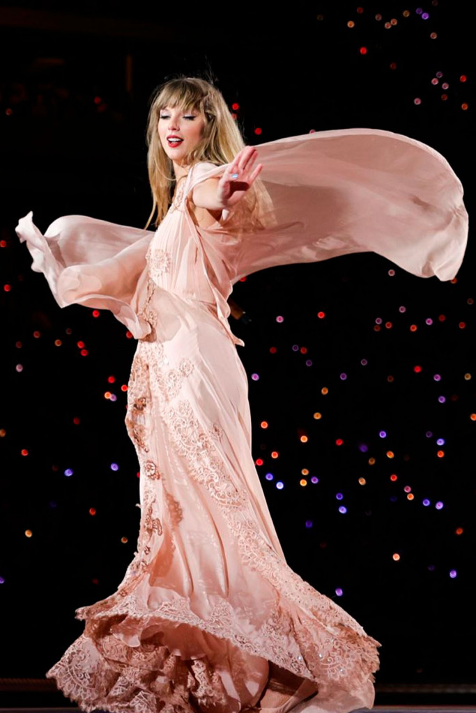 O vestido no estilo princesa em “Love Story”, as franjas douradas em “Fearless”, os tecidos fluidos em “Folklore”, o macacão de cobra em “Reputation”, os brilhos extravagantes em “Midnights” – cada peça comunica uma história. Com styling de Joseph Cassell Falconer, seus looks sob medida foram assinados por marcas como Versace, Oscar de la Renta, Roberto Cavalli, Alberta Ferretti e Zuhair Murad.