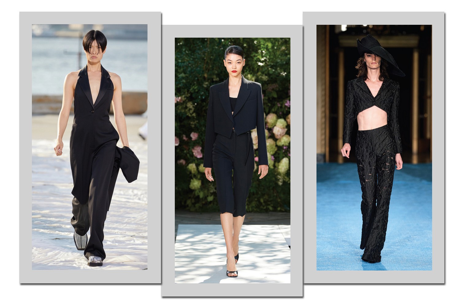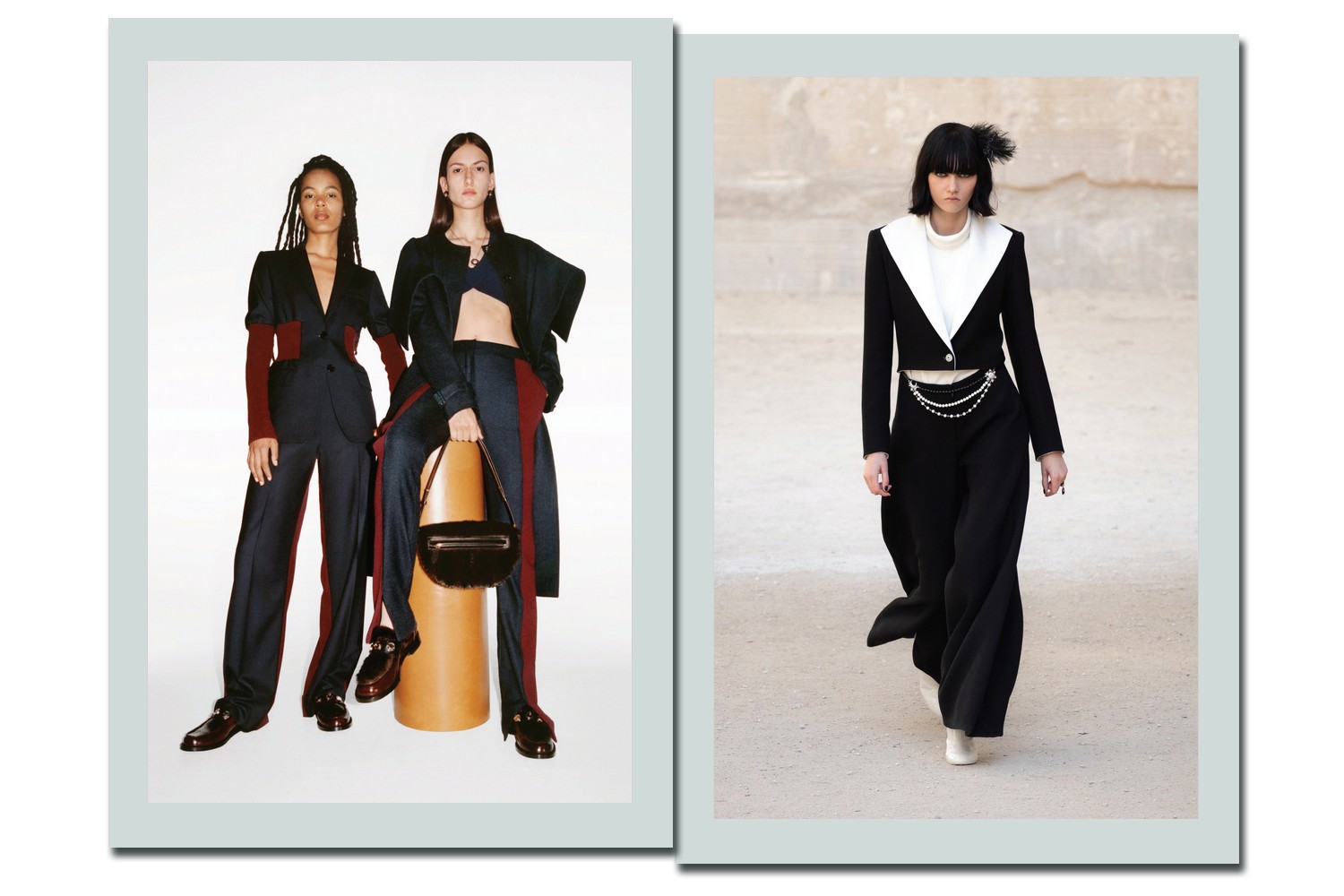 Essa nova alfaiataria também é cheia de híbridos: o resort 2022 da Balmain chega com um spencer que ganha amarração saindo da lapela, deixando a barriga de fora, tipo camisa amarrada. Na Burberry, o paletó ganha recortes mais justos em malha que o acinturam e dão graça para a manga. A Chanel amplia a lapela branca, em contraste com o “quase spencer” preto, levemente curto, de um botão só.
