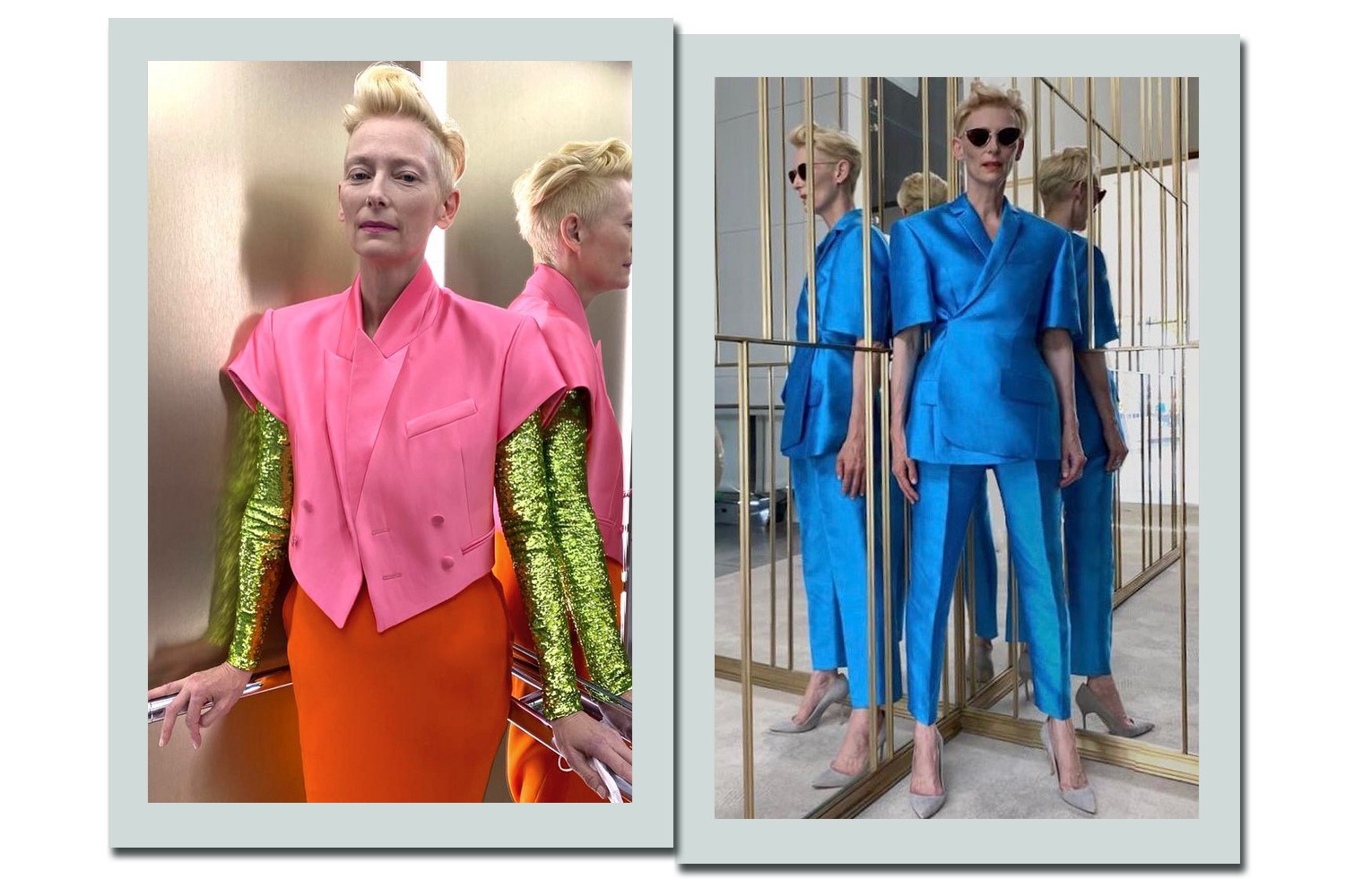 Mas eis que Tilda Swinton apareceu no tapete vermelho de “The French Dispatch”, novo longa de Wes Anderson, no último Festival de Cannes, em julho. Todo mundo comentou a química interessante entre ela e Timothée Chalamet, porém também reparou nos looks: ele de terninho prata Tom Ford e ela de… spencer. Sim, spencer: com a barra pontuda, de manga curta, pink, usado com um vestido por baixo e uma manga longa segunda pele douradíssima. A peça criada por Haider Ackermann deu uma pista: será que a nova alfaiataria vem aí, dessa vez de verdade, com o pessoal aderindo no dia a dia? Na tarde seguinte, no photocall do mesmo filme, mais um look icônico de Ackermann em Swinton: era um paletó azul celeste transpassado e de mangas até o cotovelo.