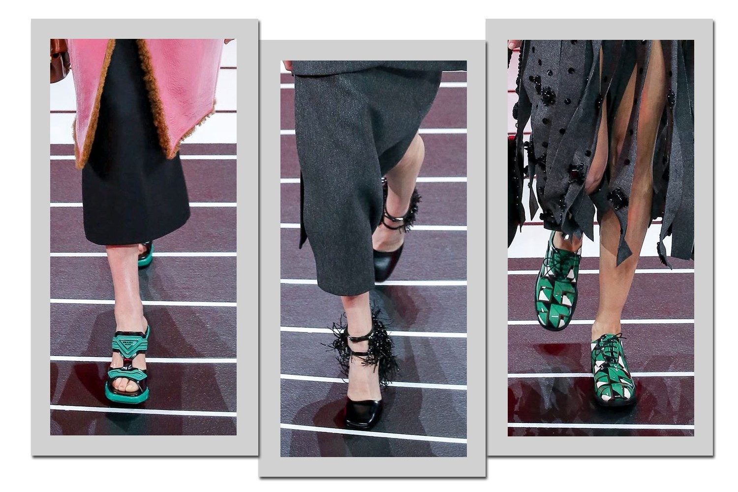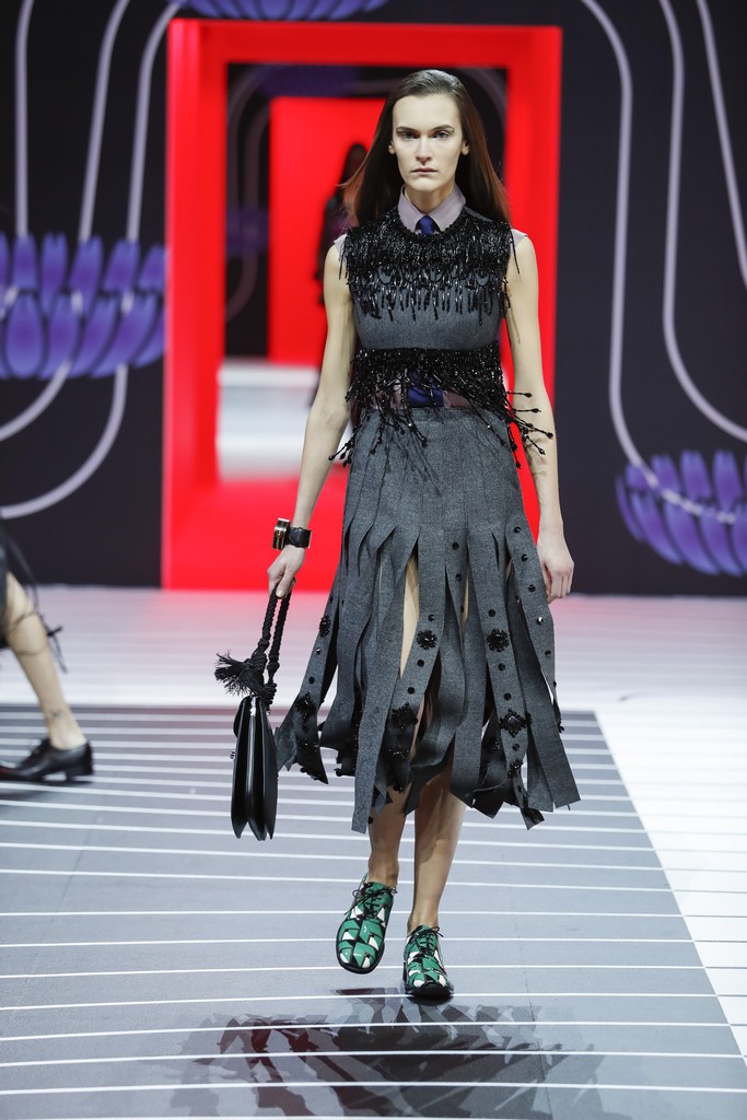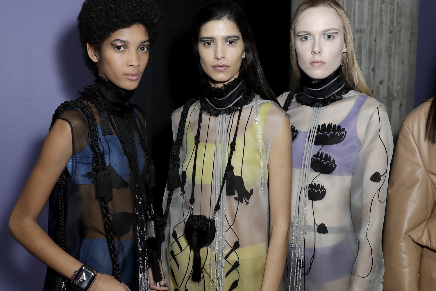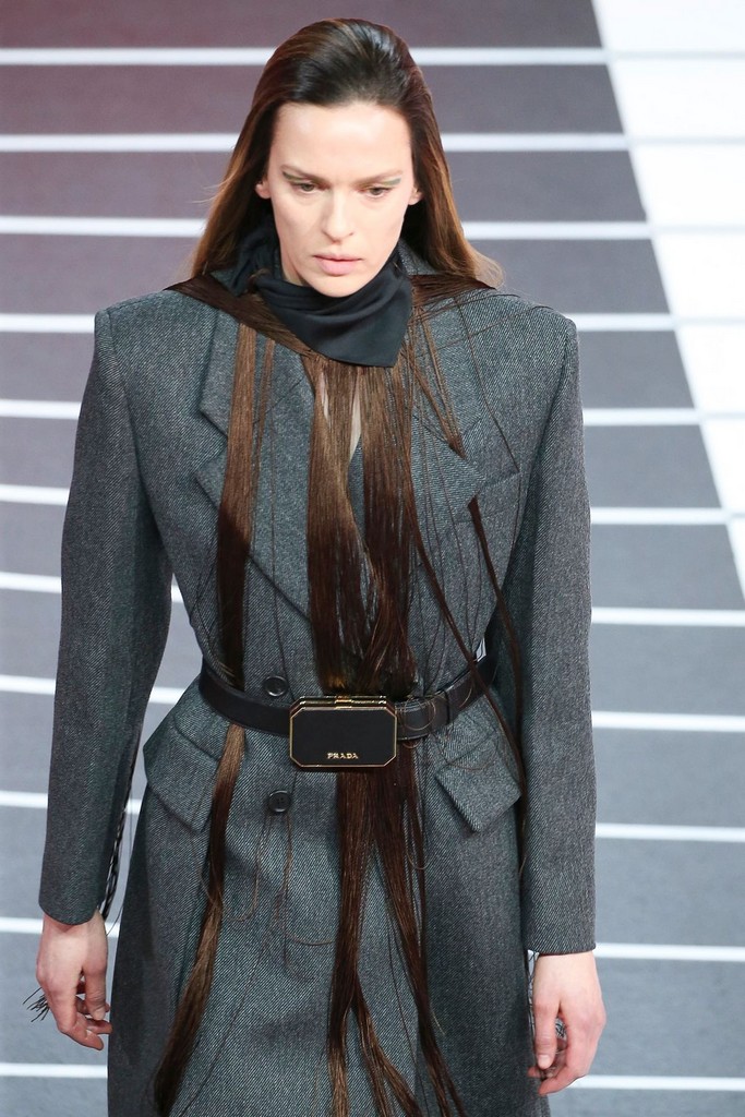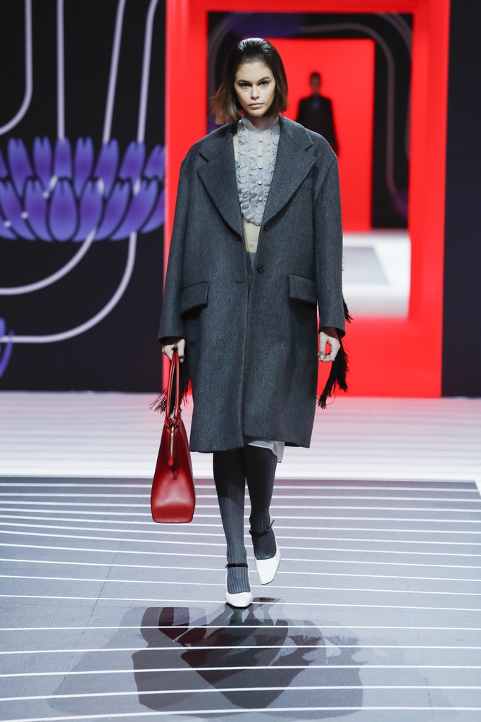 Para o inverno 2020 da linha feminina da Prada, Miuccia opta por dar sequência à temática trabalhadora que foi mote do desfile masculino, apresentado em janeiro. Duas piscinas, armadas na Fondazione Prada, foram palco para uma sequência de looks office. Paletós com gravatas, na grande maioria, serviram de base.