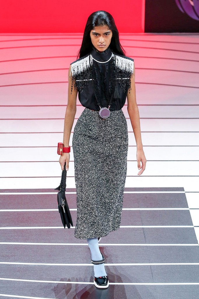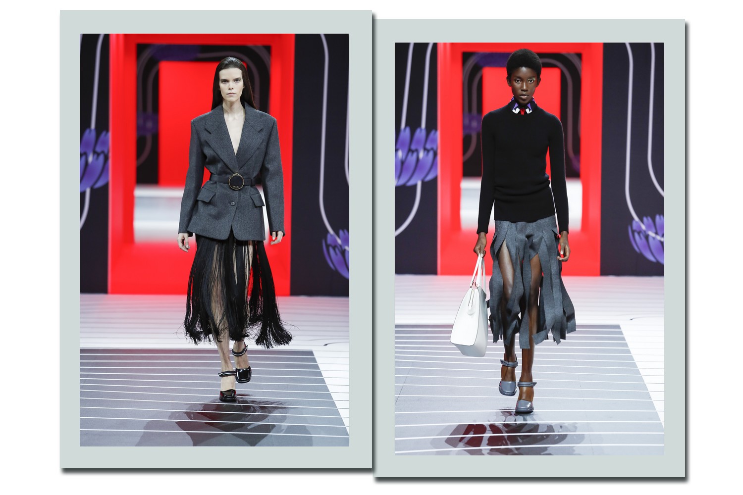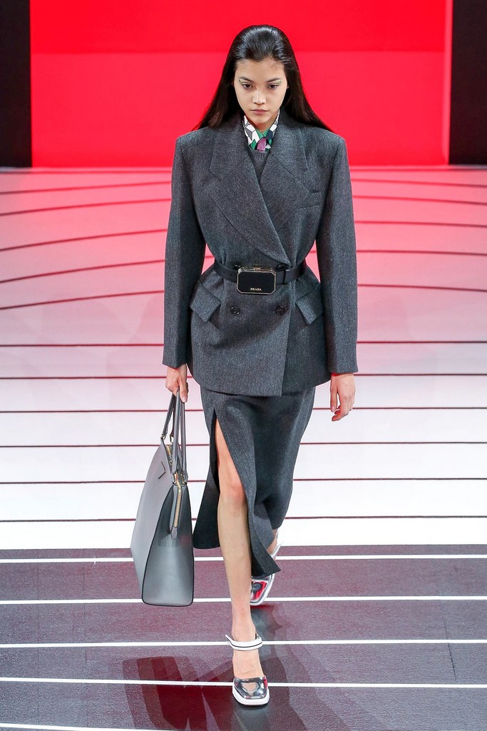 Semelhante a um triângulo de ponta-cabeça, um dos shapes que se destacou no desfile da Prada foi o do conjunto da imagem acima: ombros armados e estruturados, cinto marcando o blazer e saia reta.