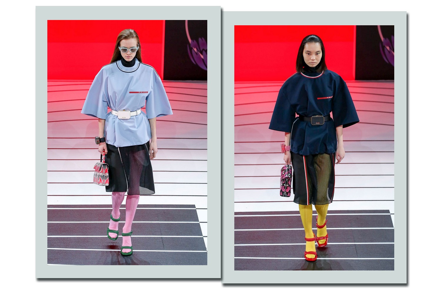 A sobreposição ganhou uma cara diferente no verão 2020 da Prada: conjuntos de cropped top e saia foram usados sobre camisas sociais sem manga.