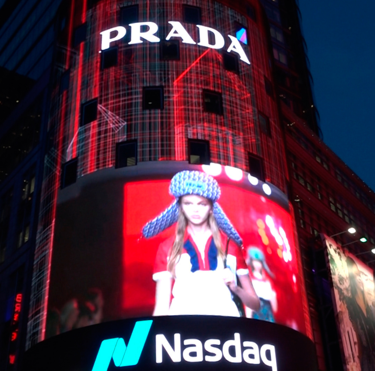 A cover-girl da edição de maio da Bazaar brilhou no desfile. Fazendo uma das últimas entradas na passarela, ela foi eleita pela própria Prada para representar a foto que registrou o livestreaming do show no telão da Times Square.