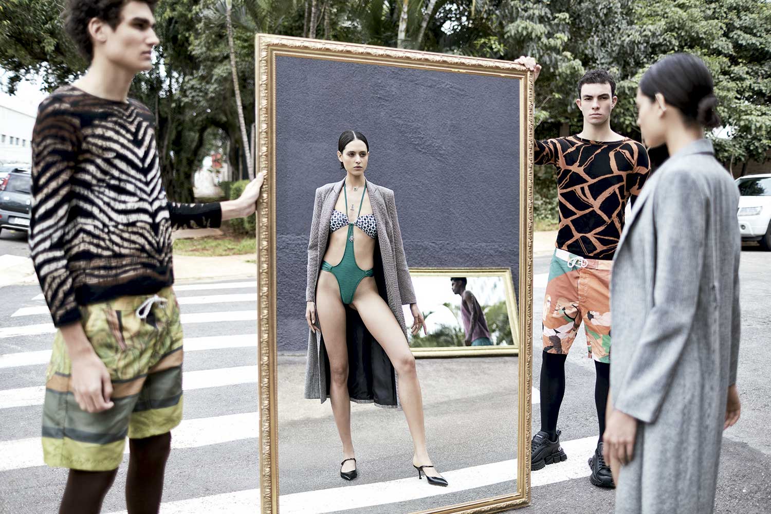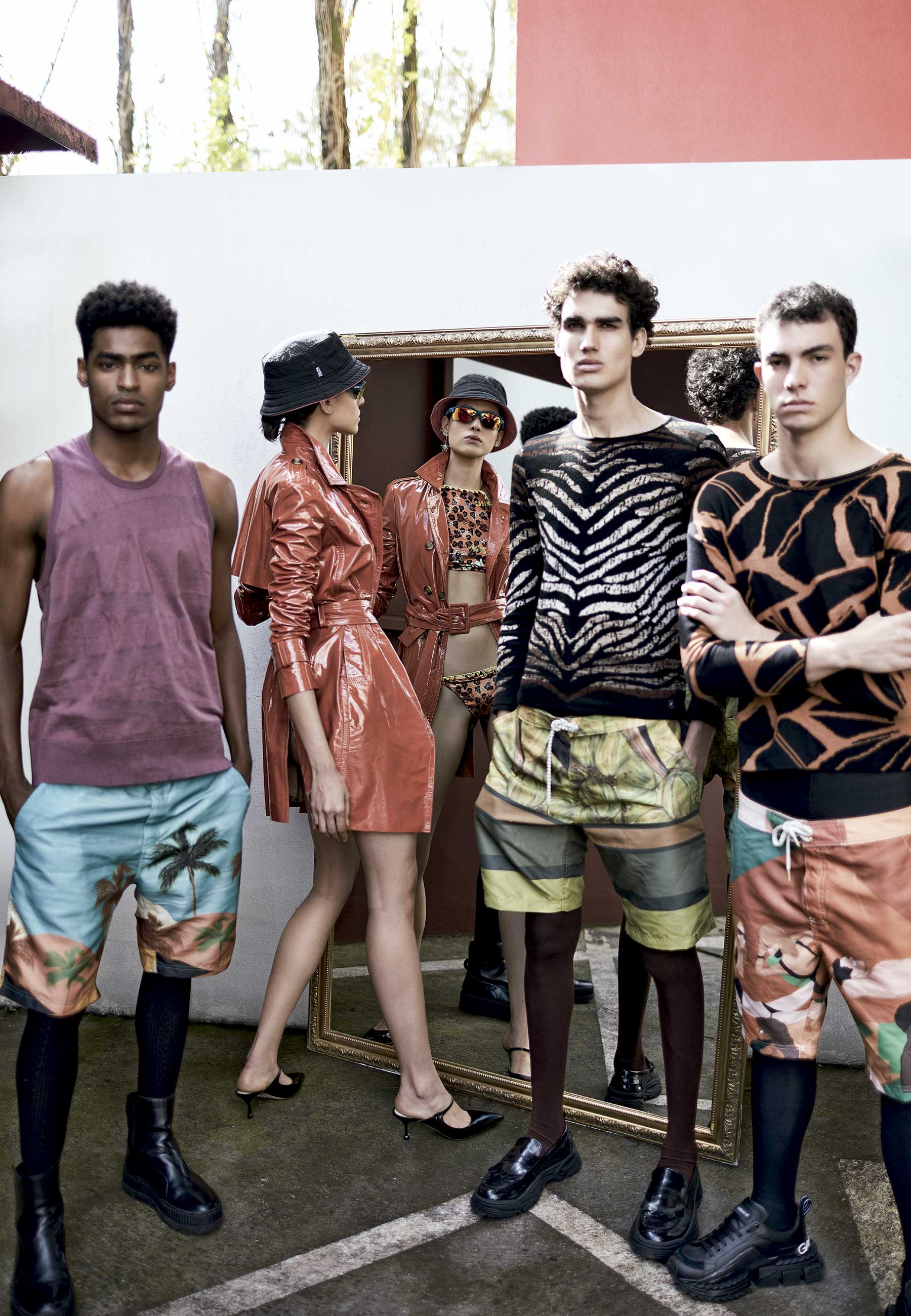 Leonardo Novaes (Way) usa regata de tricô Ermenegildo Zegna, bermuda Água de Coco, legging Lupo e sapatos Fenty Puma; Gabriel Veiga (Allure) usa tricô Viviane Furrier, bermuda Água de Coco, legging Lupo e sapatos Zara; João Anselmo (Allure) usa tricô Ellus, bermuda Água de Coco, legging Lupo e sapatos Dolce & Gabbana. Ela veste maiô New Beach e brincos em ouro branco, pérolas e turmalina Carla Buaiz.