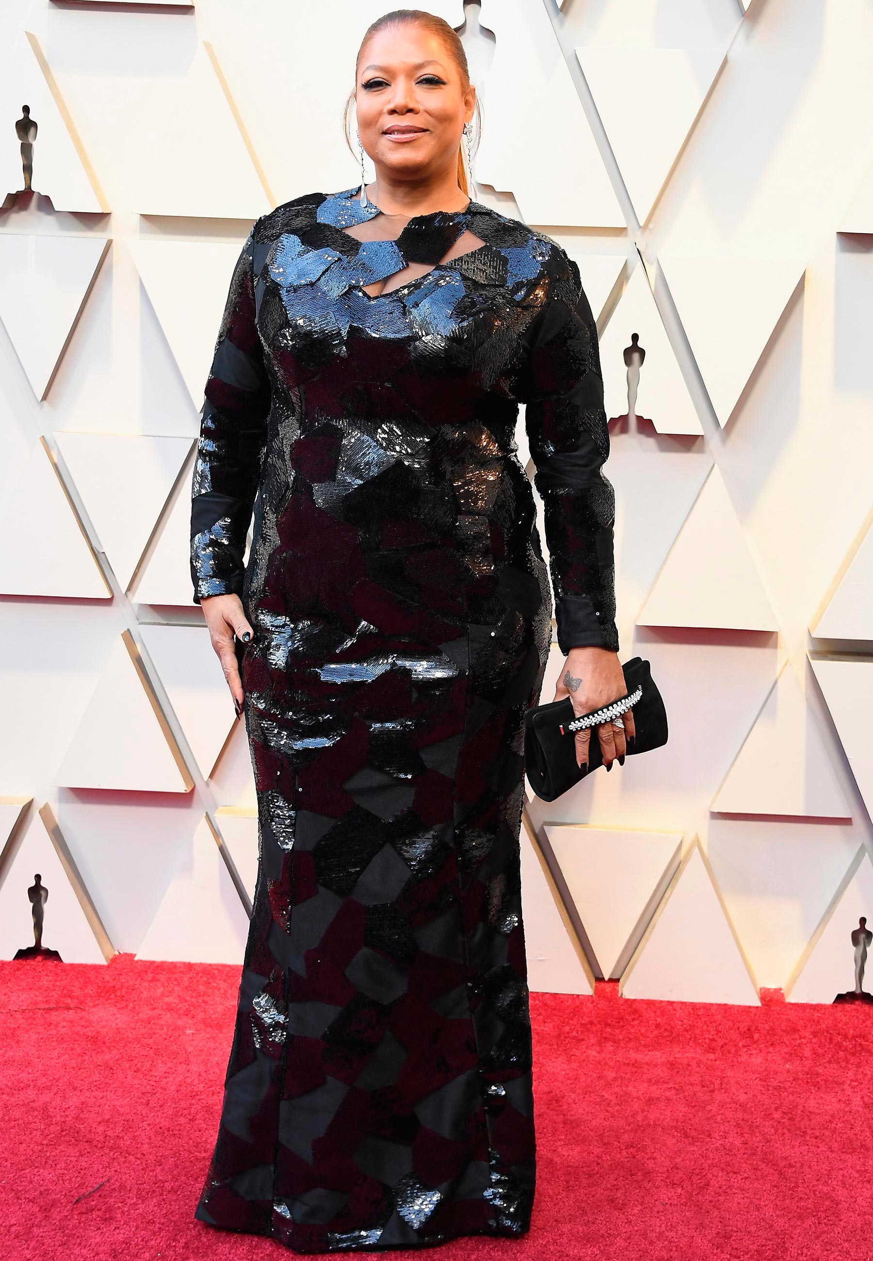Um toque de brilho sutil no pretinho de Queen Latifah, do estilista Michael Costello.