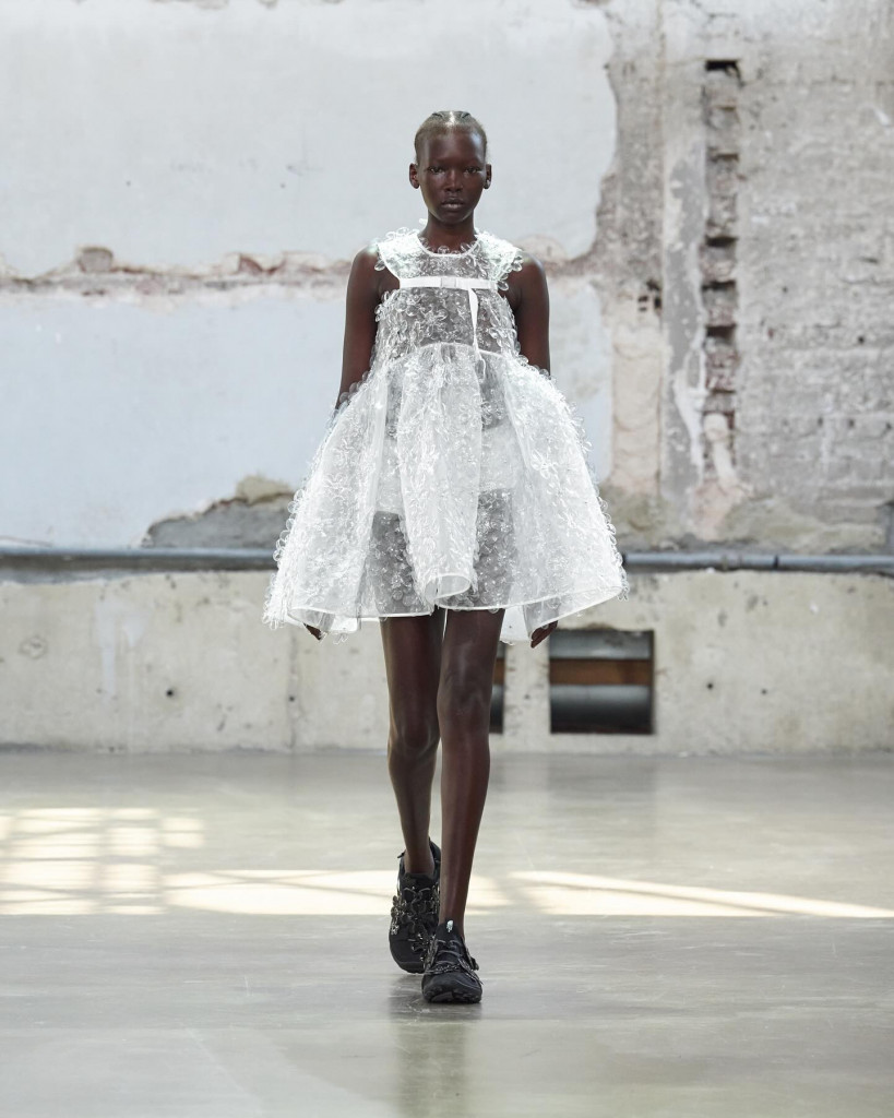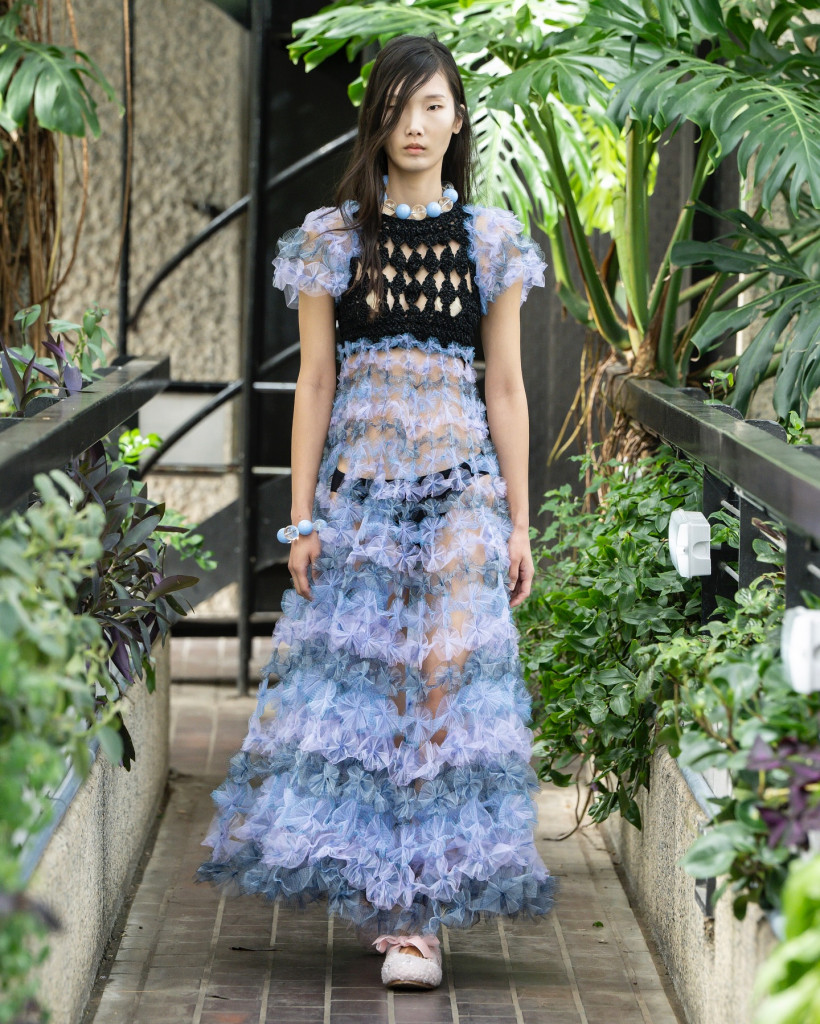 A experimentação têxtil é outro ponto alto: materiais reaproveitados, técnicas artesanais e acabamentos tecnológicos se unem em construções inovadoras — um reflexo direto da busca por propósito e singularidade. Com o debut de Matthieu Blazy, é notório a sua vontade de experimentação têxtil na maison, como a abertura das tramas nos clássicos tweed de Chanel e também na malharia da maison, que trouxe inovações a códigos tradicionais.