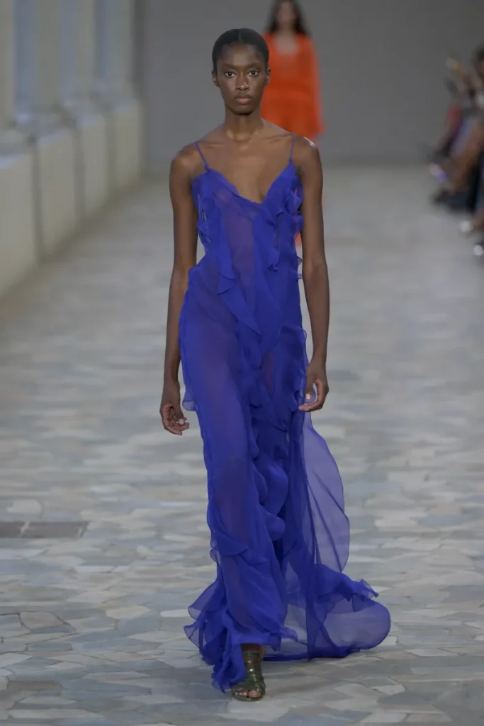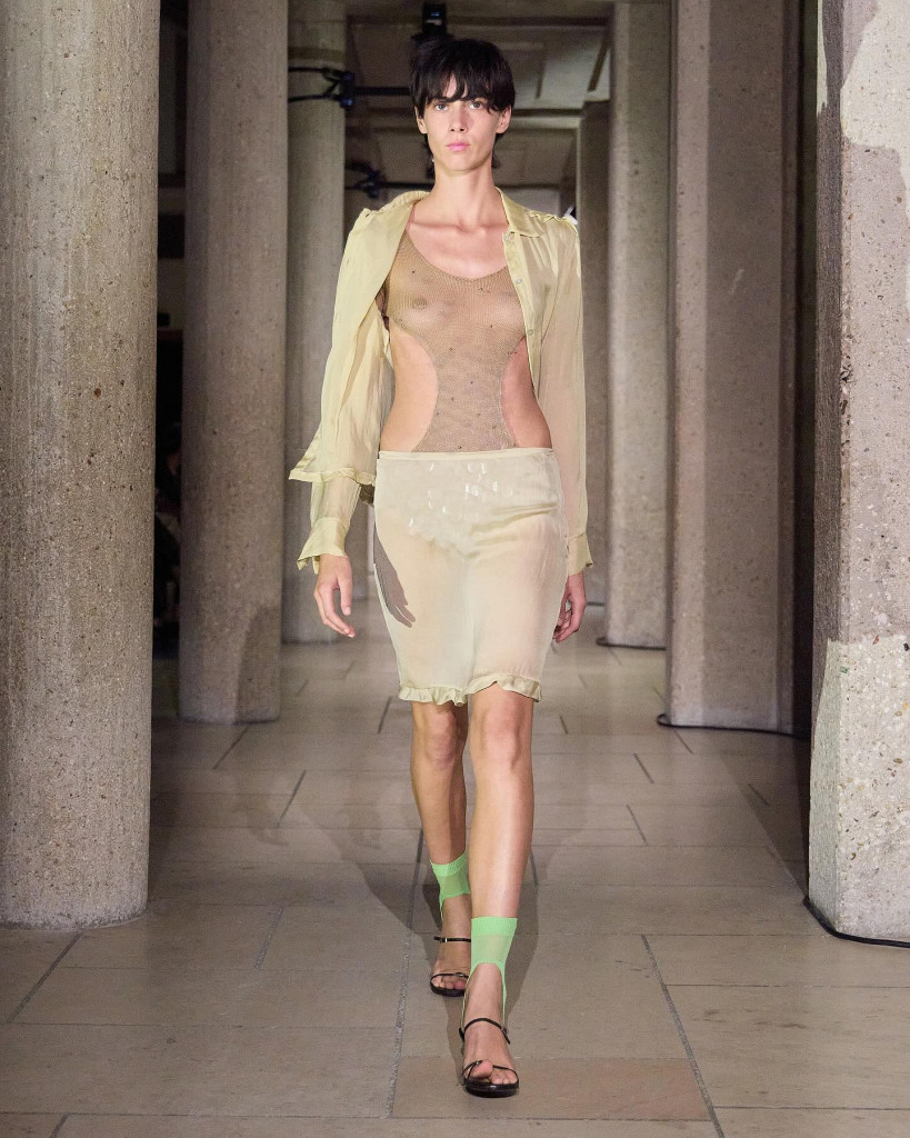 A transparência surge como o símbolo máximo dessa liberdade. Tecidos leves e reveladores apareceram em marcas como Schiaparelli, Paloma Wool e Cecilie Bahnsen, revelando uma sensualidade delicada e poética. No street style, o movimento também foi marcante: muitos fashionistas apostaram em tecidos translúcidos para compor produções que celebram o corpo e a liberdade de se vestir.
