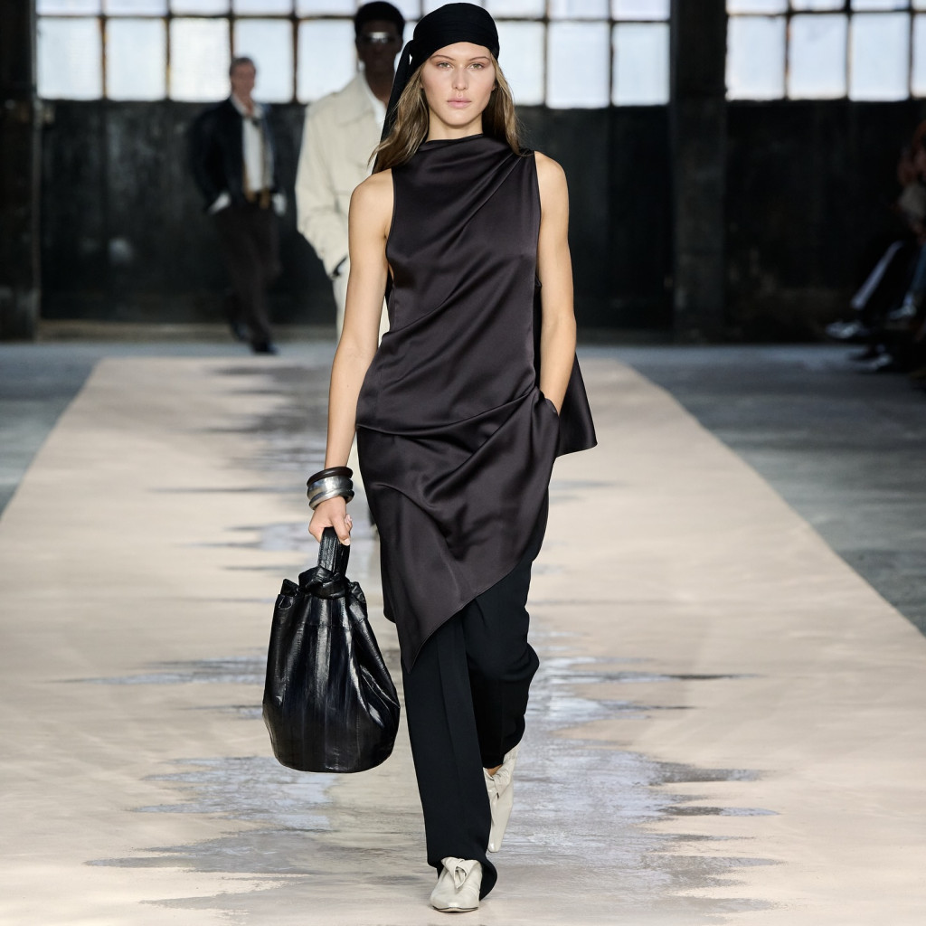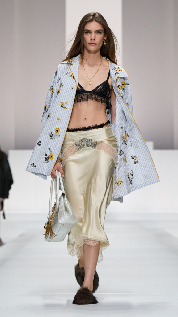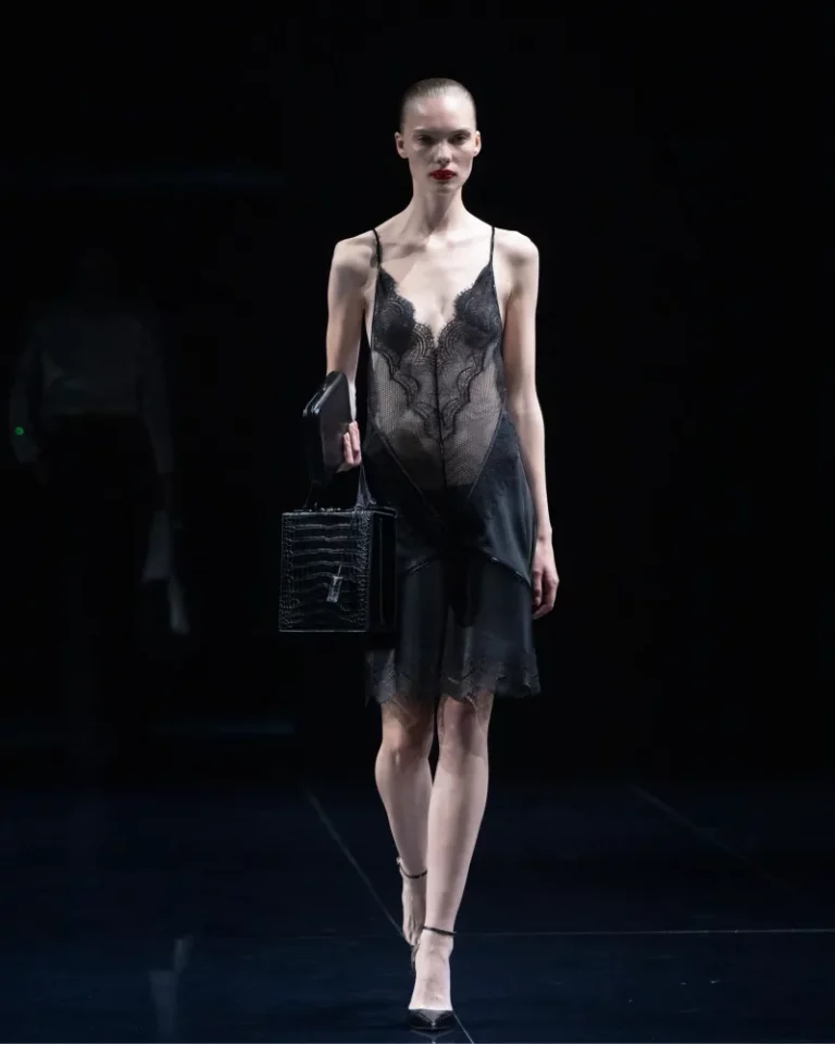 Na mesma direção, a lingerie abandona o espaço íntimo e ganha protagonismo nas produções — seja em corsets estruturados, sutiãs rendados sob camisas transparentes ou combinações de seda usadas à luz do dia. Até os pijamas entraram em cena no desfile da Dolce & Gabbana, misturando-se a lingeries e peças de alfaiataria para encontrar o equilíbrio entre conforto, sensualidade e sofisticação. A tendência também apareceu em desfiles como Acne Studios e Tom Ford, reforçando a ideia da roupa como extensão da pele.