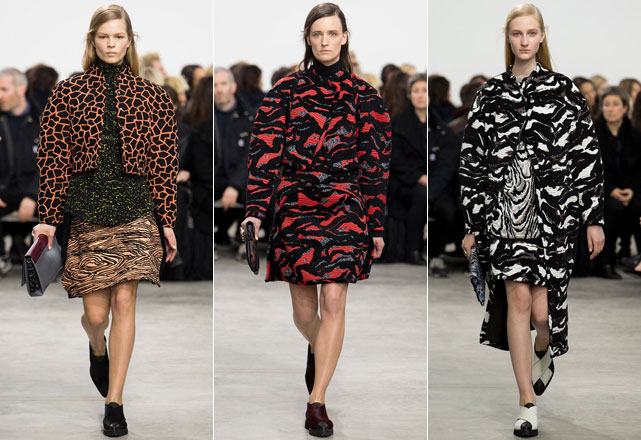 A Proenza Schouler fez desfile impecável, de silhueta estruturada e superfeminino, amparado por um ótimo styling. A profusão de estampas e texturas produziu lindos looks em que o crash de animal prints (onça, zebra, girafa) deu vida a produções clássicas, de casacos e jaquetas de mangas arredondadas, usados com saias pelos joelhos e calças sequinhas.