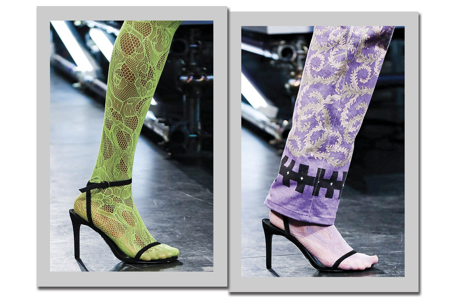 A Pucci investe em sandálias muito práticas, de tiras finas, que podem ser usadas em qualquer ocasião. O truque de styling aqui é apostar na meia-calça de renda.