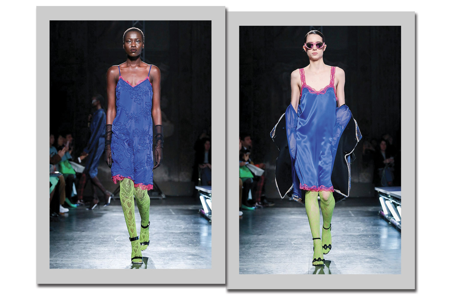 Os neons pontuam quase toda a coleção. Lenços são amarrados nas pernas e na cabeça, com óculos muito bem elaborados, e a coleção apresenta um mix entre o streetwear e o boudoir, com slip dresses e lingeries à mostra.