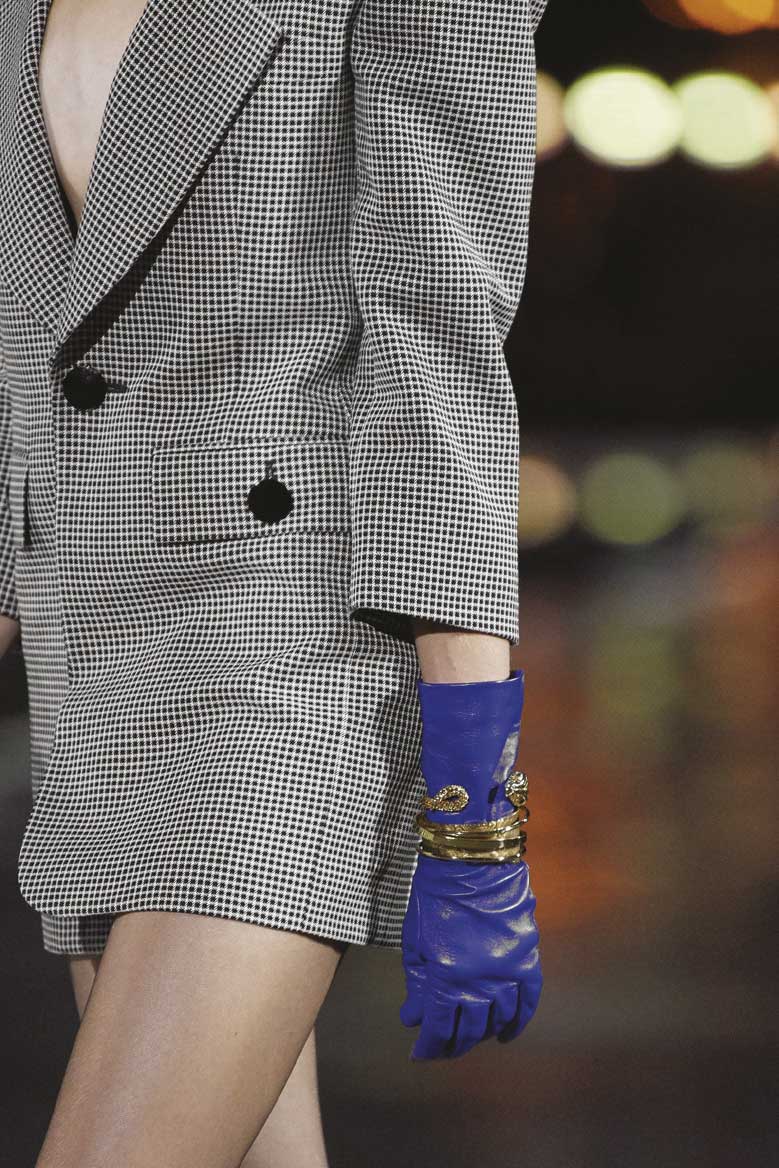 Como era de praxe com Yves Saint-Laurent, as pulseiras continuam uma marca registrada da maison. Nos últimos desfiles de verão e inverno da grife, as famosas manchettes adoradas pelo estilista também ganharam seu lugar de predileção com o designer Anthony Vaccarello. Em metal dourado e prateado, elas vêm grossas e esculturais, em formato de serpente, contorcidas e irregulares por cima de luvas de couro coloridas. Quando mais finas, surgem coladas ao corpo. Quanto mais sexy, melhor!
