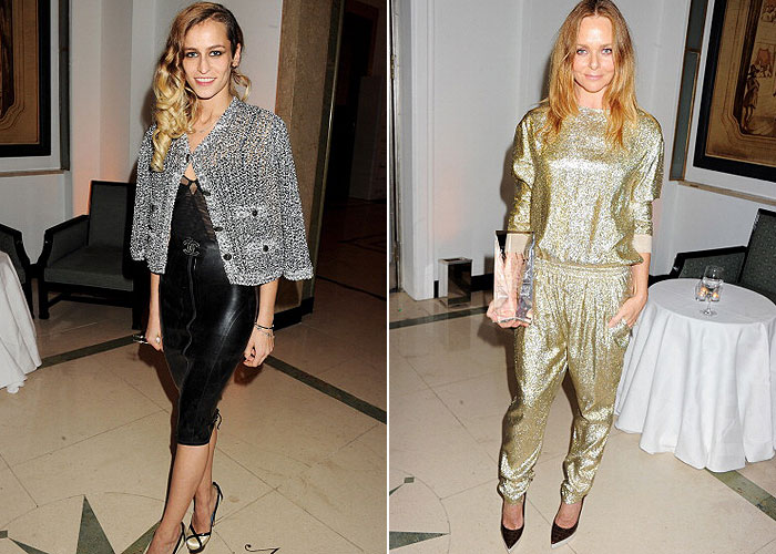 À esquerda, Alice Dellal, de Chanel; à esquerda, o macacão dourado cheio de brilhos de Stella McCartney.
