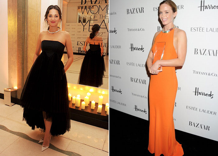 À esquerda, Marion Cotillard e seu belo vestido preto. À direita, Emily Blunt prefere o laranja.