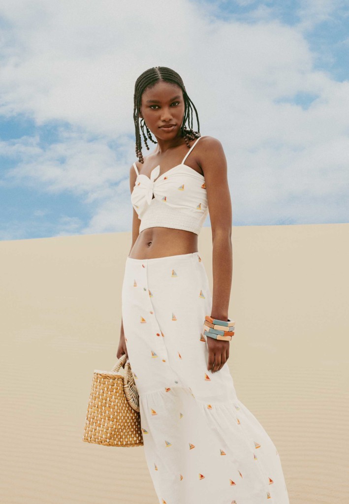 O tradicional vichy também ressurge de diversas formas e em versão máxi. Tricolines (lisos, bordados ou estampados), linho, laise, jacquard, além de crochê, tricô e broderie resgatam o aspecto artesanal da linha. Para o look urbano e jovem, a Renner aposta nos anos 2000, com a alfaiataria contrapondo com o esportivo.