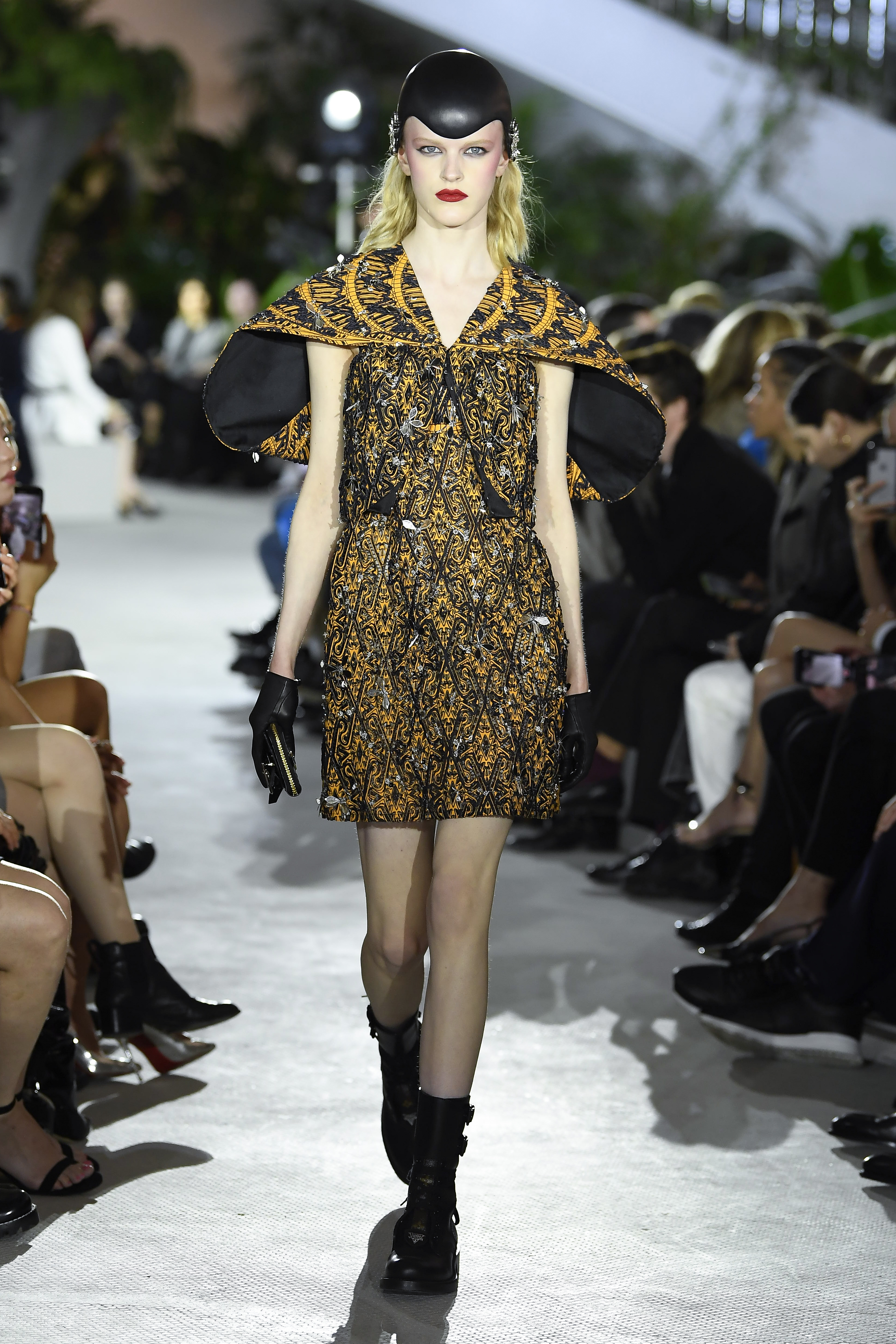 A maison se mantém jovem nas proporções míni das saias combinadas à alfaiataria certeira e característica da marca, mas as tocas/capacetes somados aos óculos de ar futuristas elevam o total look em um styling que, no inverno 2019, eram apenas toucas de tricô – detalhe que Bazaar ama!