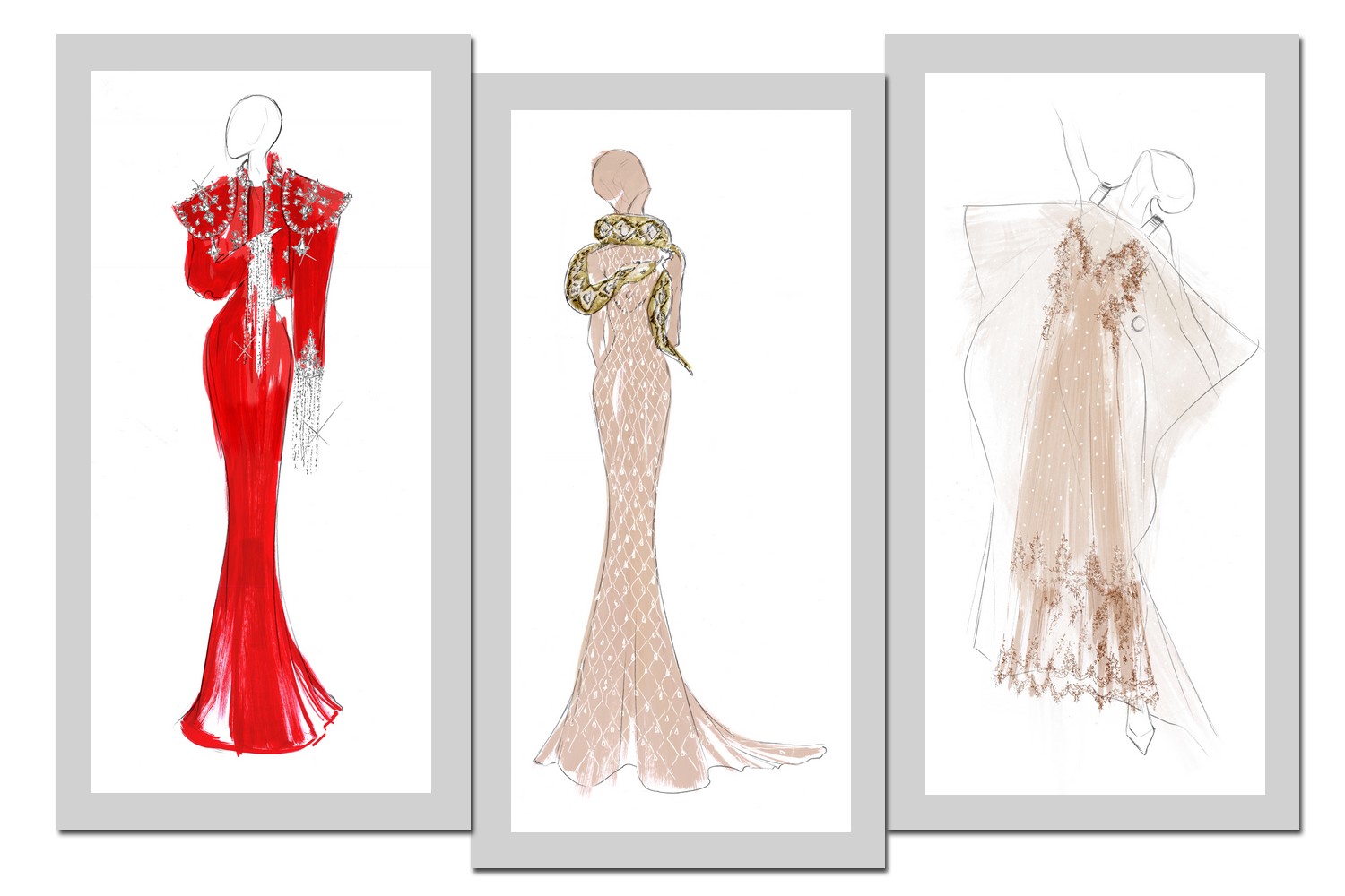 Para o capítulo sobre “Carmen”, Tisci criou uma jaqueta Toledo oversize e vermelho, com bordados e franjas de cristais, para ser usado com um vestido longo na mesma cor. Já para “Tosca”, o designer desenhou uma peça com renda Chantilly, crepe de seda, pérolas e alças de metal polido. Para “Otello”, a escolha foi um vestido transparente sem mangas, com um detalhe que conecta a peça às mão com cristais em forma de lágrima.