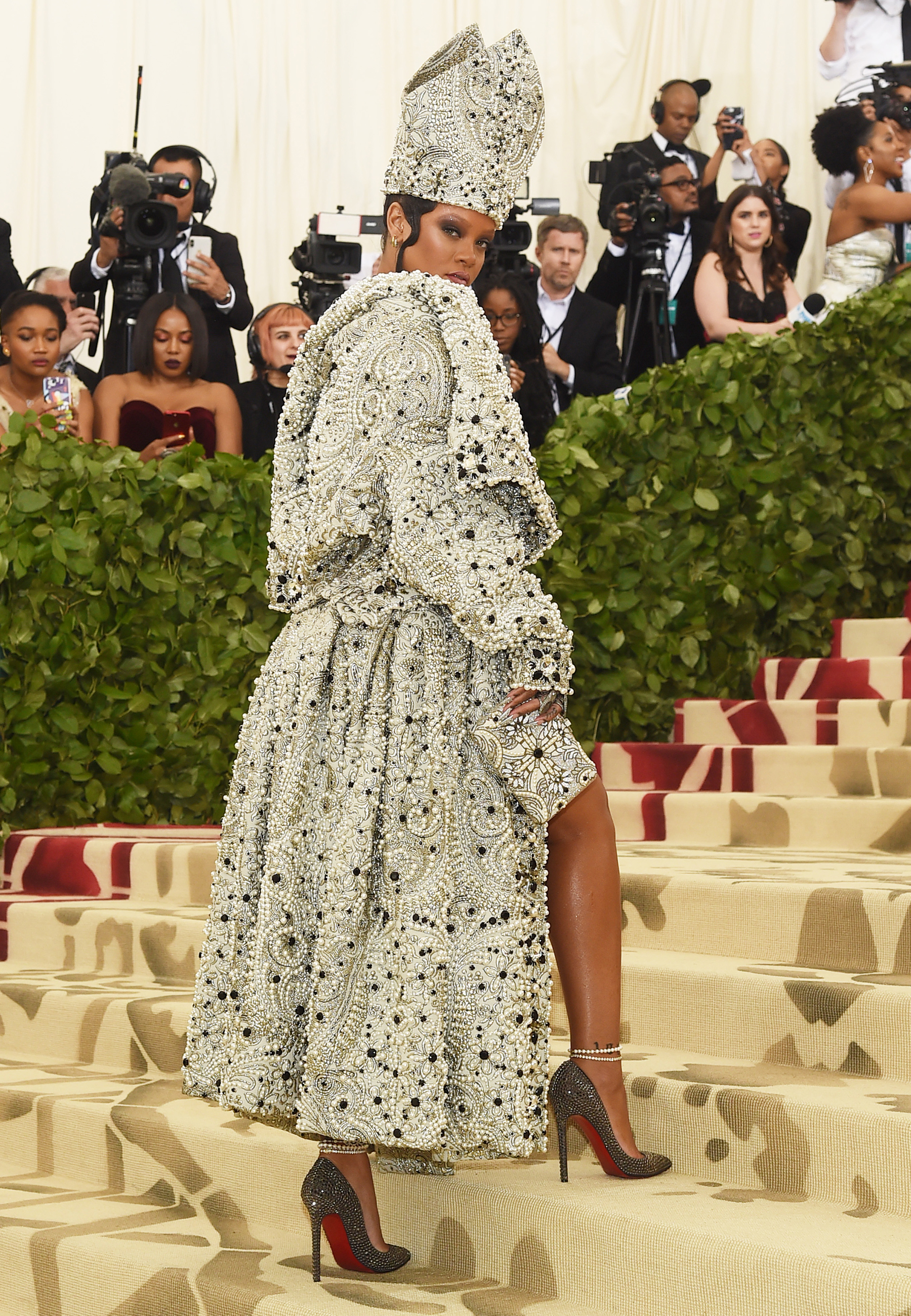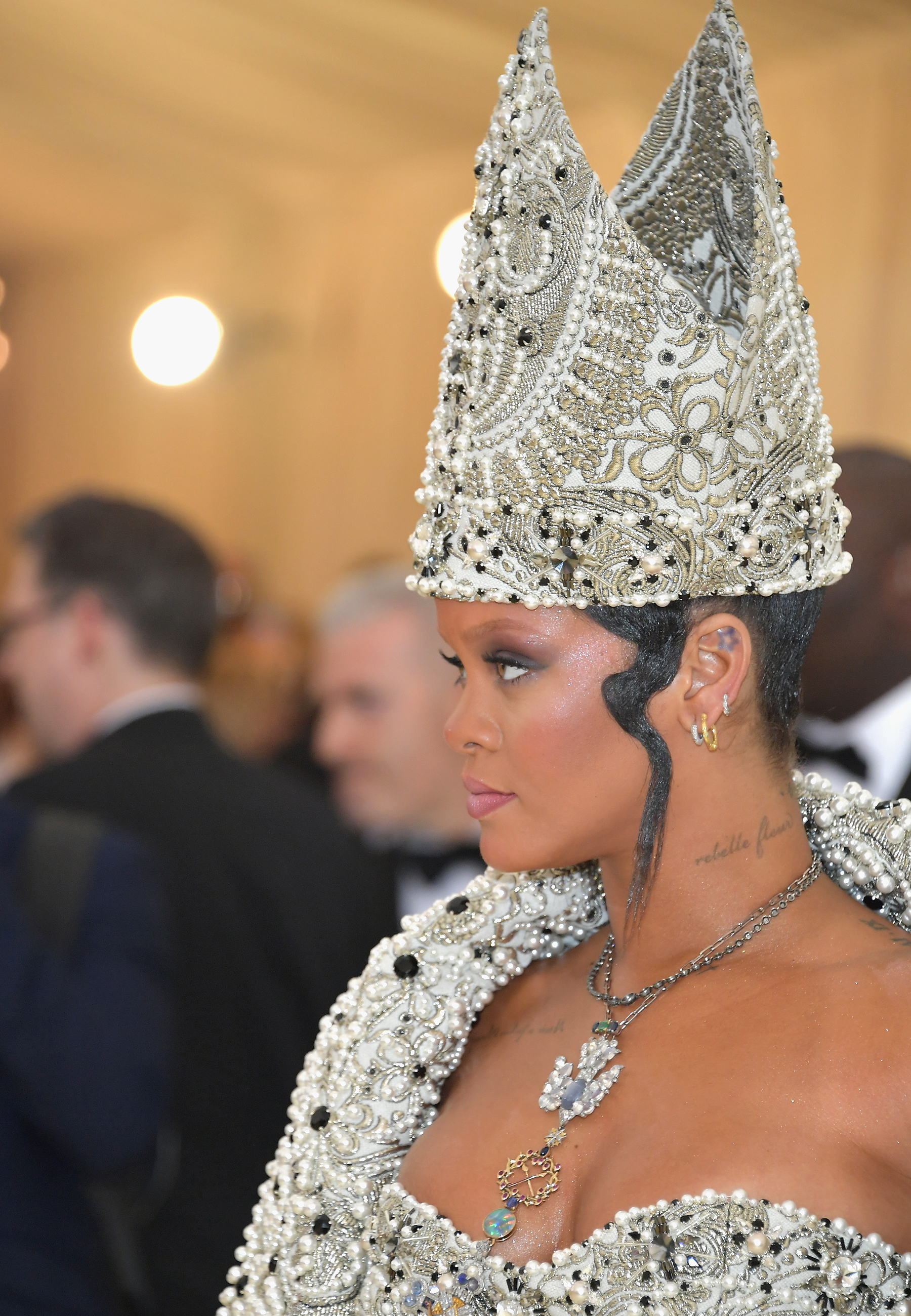 Rihanna não poderia deixar de causar um impacto ao chegar no red carpet do MET Gala, que acontece nesta segunda-feira (07.05), em Nova York. A pop star, que é anfitriã da festa, ousou em seu acessório de cabeça: a reprodução de um chapéu muito usado por bispos da igreja católica – e até por papas – em cerimônias religiosas.