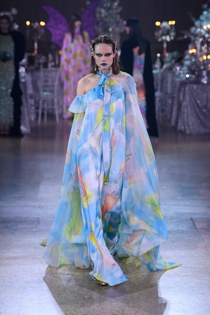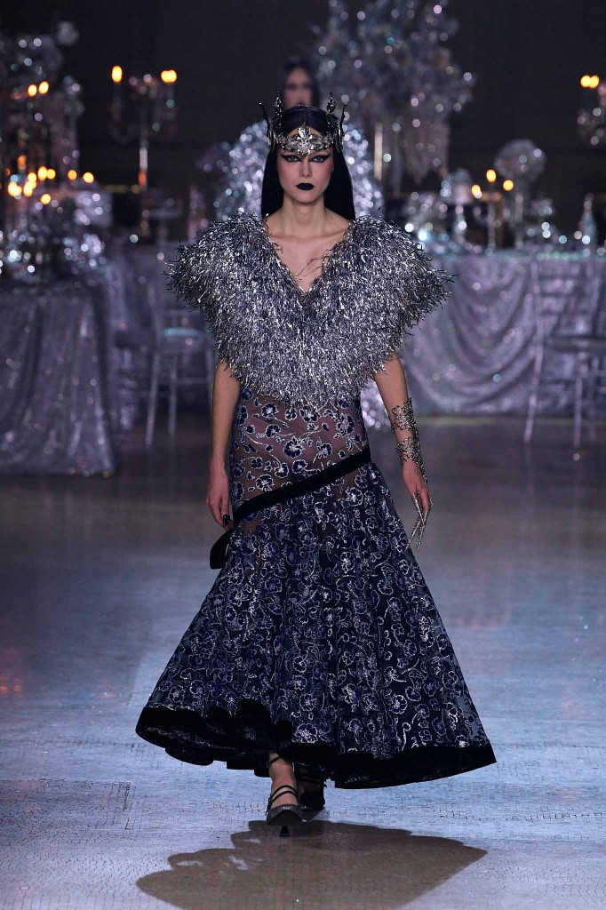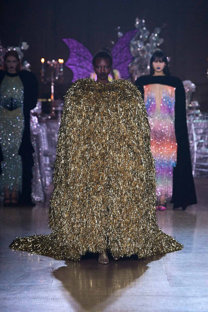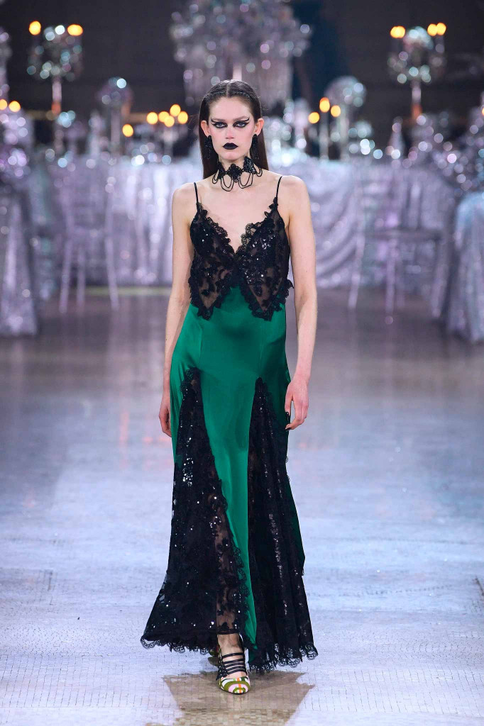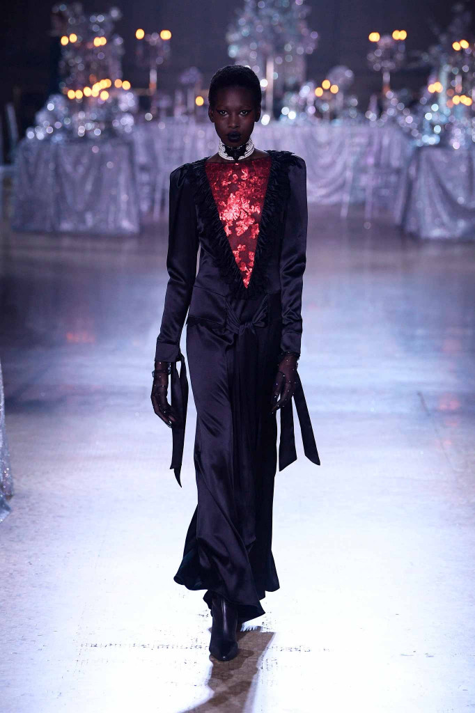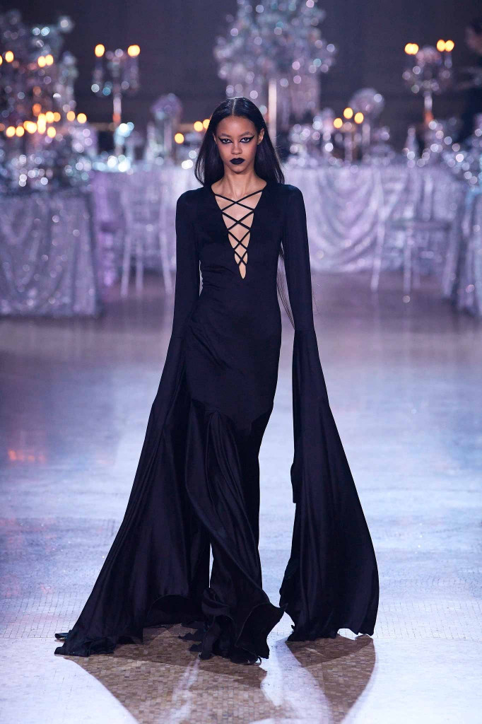 Mas esta não é uma coleção para qualquer tipo de fada: a temporada da label é escura e gótica. Tanto que as modelos ganharam uma maquiagem poderosa ao redor dos olhos e batom preto. Vestidos pretos em jersey e veludo abriram o desfile, com mangas boca de sino megadramáticas.