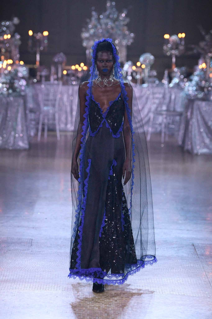 Inserções de renda preta dão um toque vitoriano à coleção, enquanto vestidos justos com contas e robes de tule falam de um glamour da Velha Hollywood.