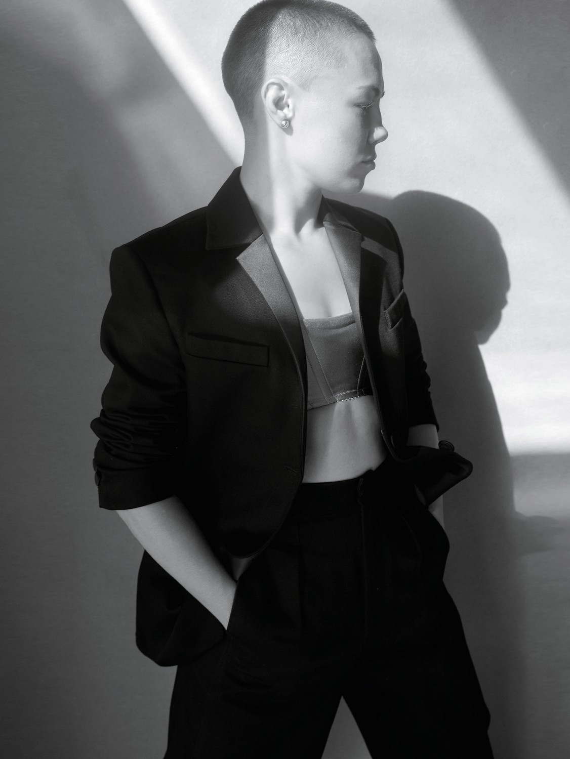 Rose Namajunas usa blazer e colete Louis Vuitton, top e shorts Nike, joias Tiffany & Co e sandálias Alexander Wang – Foto: Alex Cayley, com styling de Julien Mack, edição executiva de Filipa Bleck, beleza por Mark Edio, assistente de fotografia Tres Michel