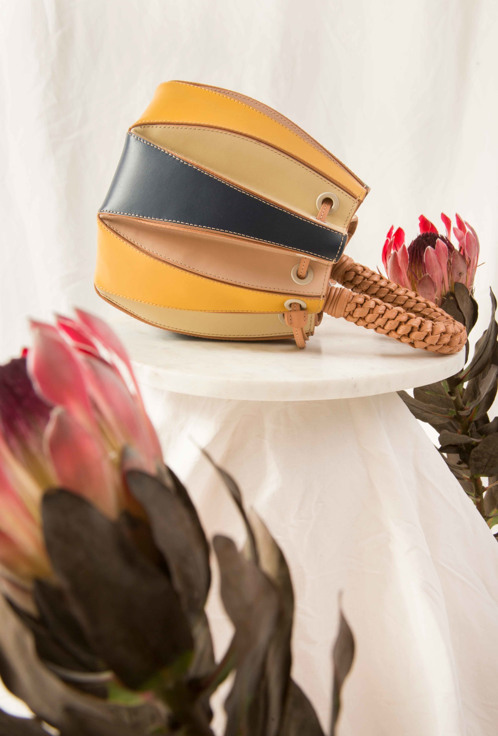 A collab apresenta o novo modelo de bolsa Okoye em três combinações de tons neutros e coloridos, entre eles o off-white, azul marinho, marrom, amarelo, rosa, laranja e roxo.